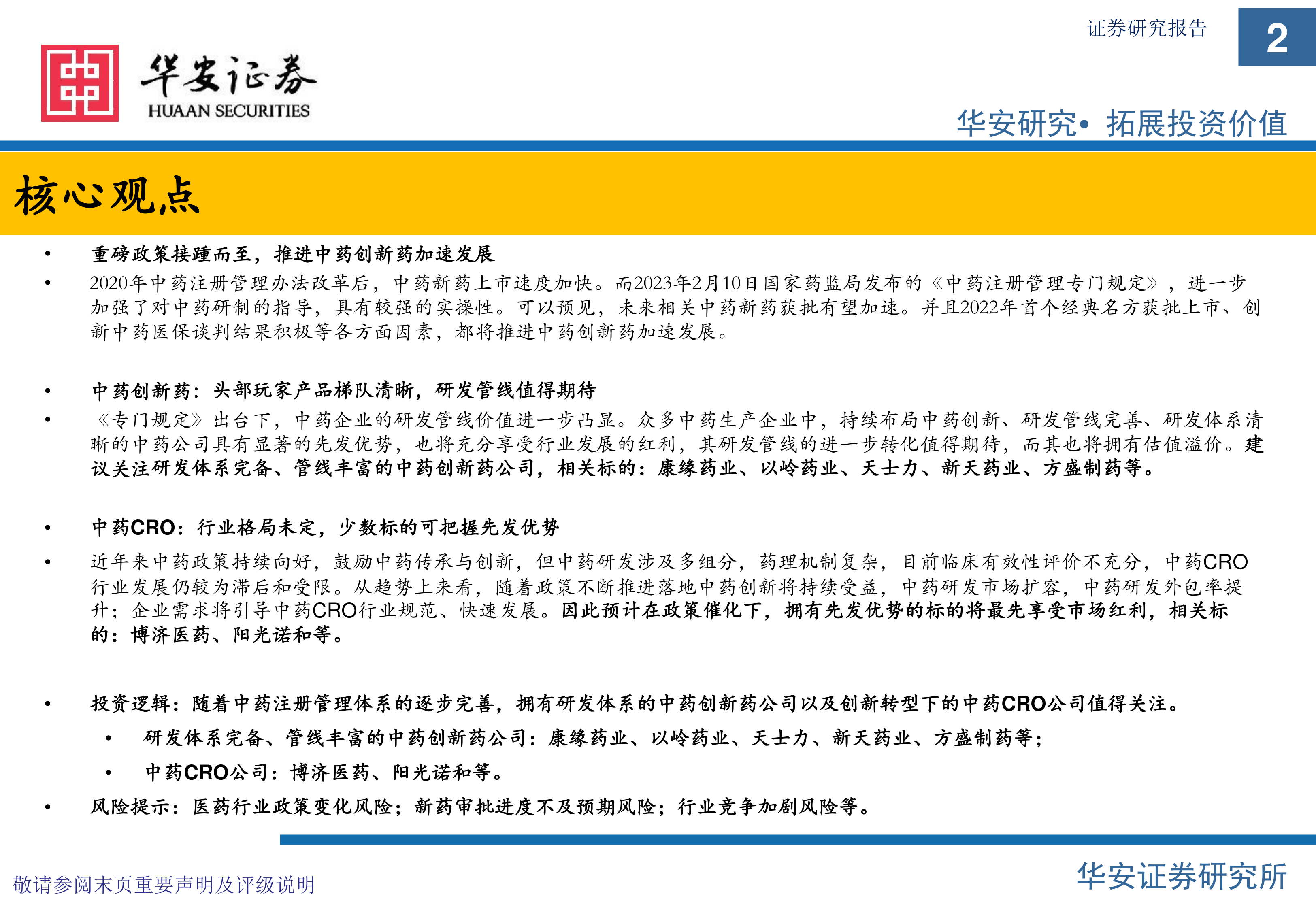 投资逻辑:随着中药注册管理体系的逐步完善,拥有研发体系的中药创新药公司以及创新转型下的中药CRO公司值得关注。