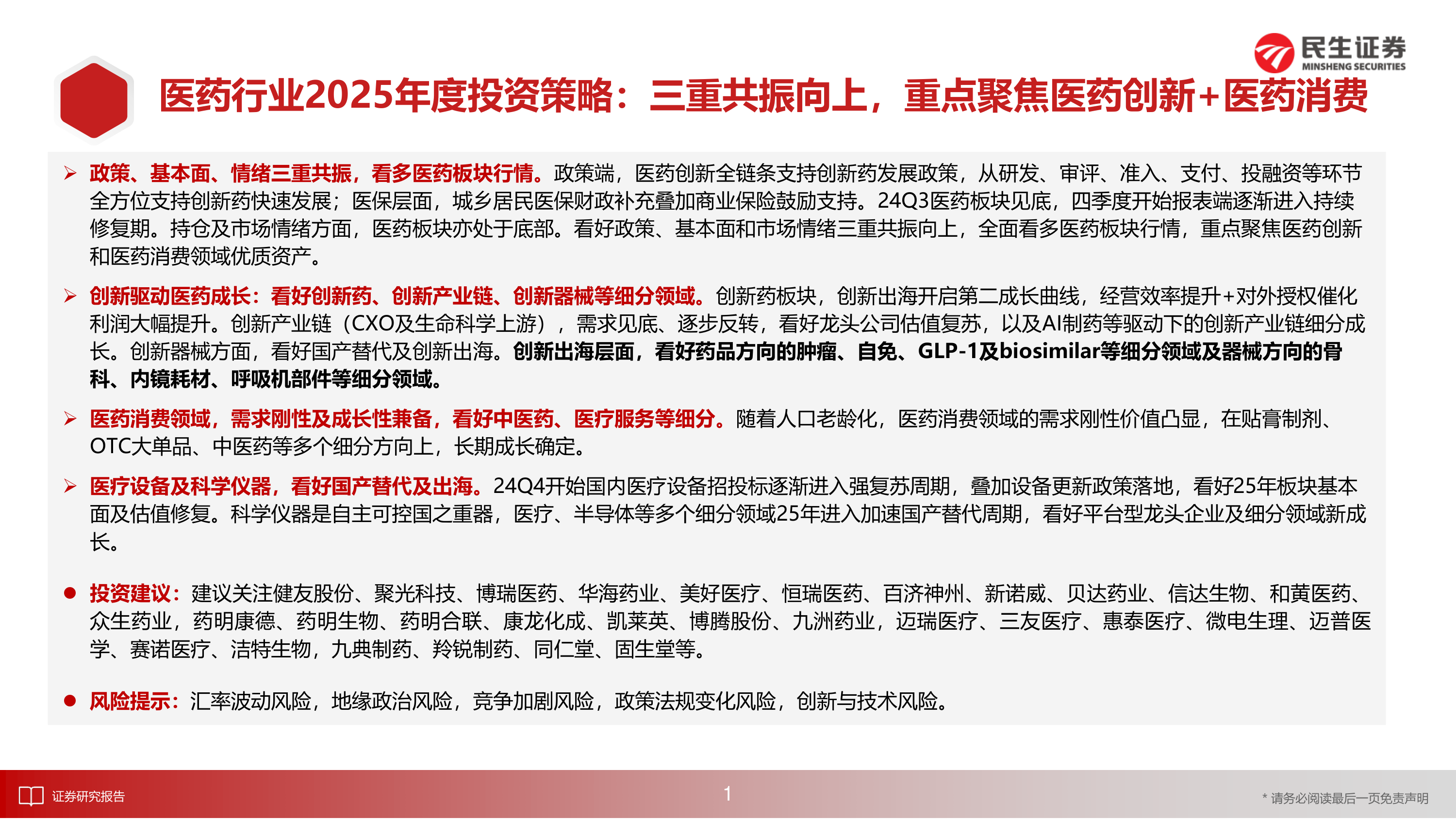 创新驱动医药成长:看好创新药、创新产业链、创新器械等细分领域。创新药板块,创新出海开启第二成长曲线,经营效率提升+对外授权催化利润大幅提升。创新产业链(CXO及生命科学上游),需求见底、逐步反转,看好龙头公司估值复苏,以及AI制药等驱动下的创新产业链细分成长。创新器械方面,看好国产替代及创新出海。创新出海层面,看好药品方向的肿瘤、自免、GLP-1及biosimilar等细分领域及器械方向的骨科、内镜耗材、呼吸机部件等细分领域。