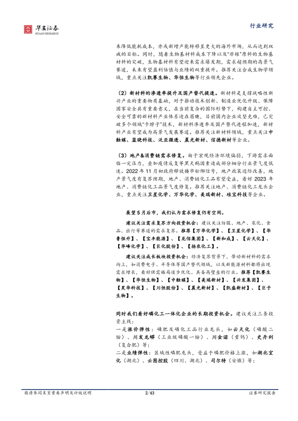 建议关注需求复苏方向投资机会:建议关注纺服、地产、农化、食品、出行等赛道的需求复苏。推荐【万华化学】、【卫星化学】、【华鲁恒升】、【宝丰能源】、【龙佰集团】、【新和成】、【云天化】、【华峰化学】、【巨化股份】、【扬农化工】。