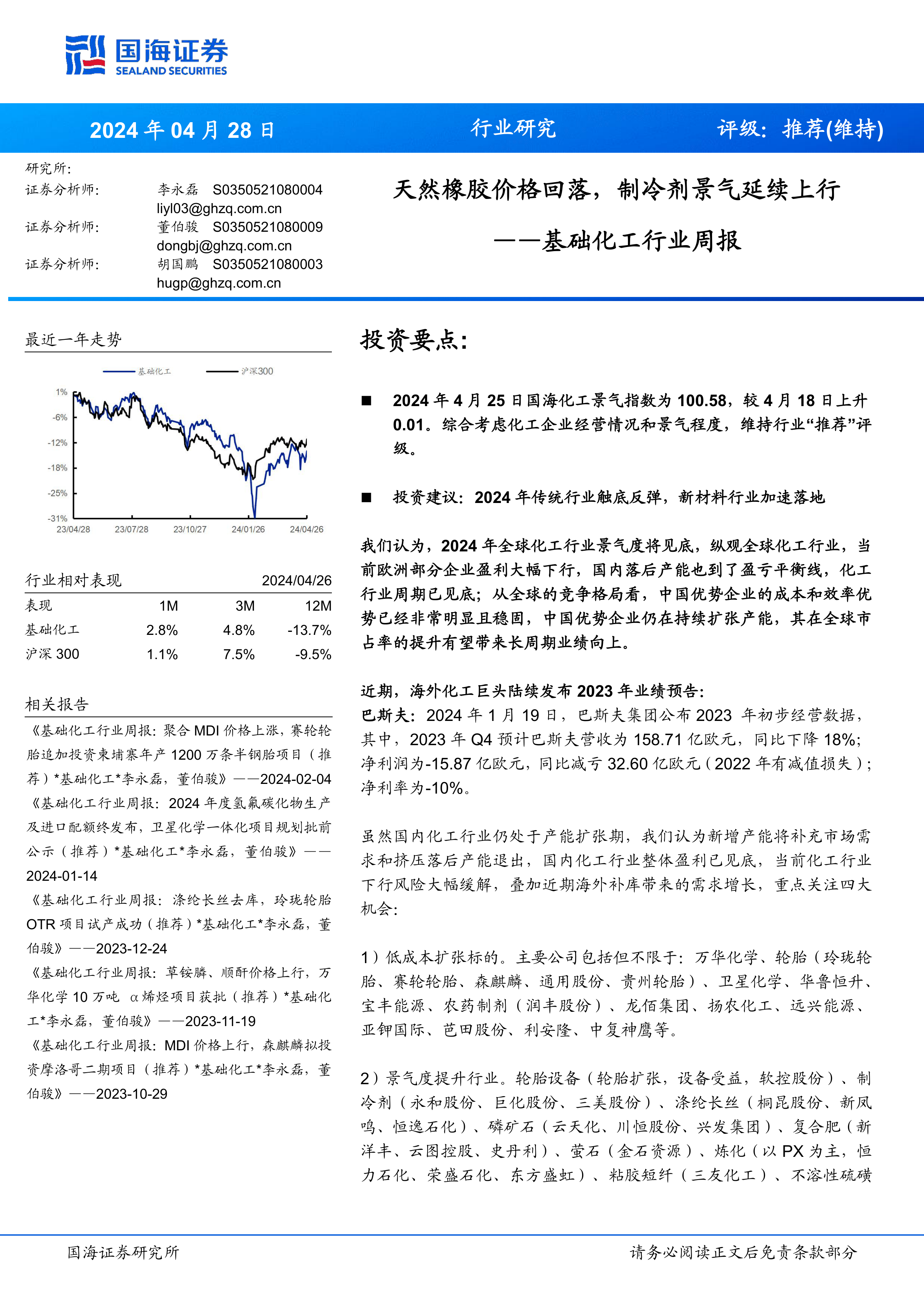 基础化工行业周报:天然橡胶价格回落,制冷剂景气延续上行