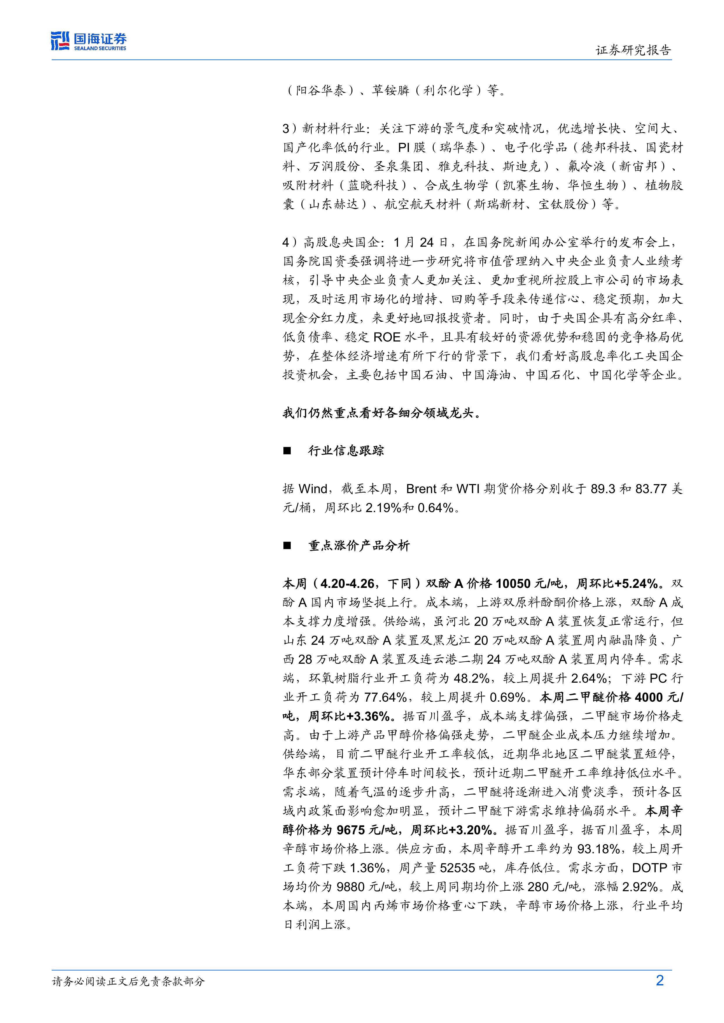 4) 高股息央国企: 1 月 24 日, 在国务院新闻办公室举行的发布会上,国务院国资委强调将进一步研究将市值管理纳入中央企业负责人业绩考核, 引导中央企业负责人更加关注、 更加重视所控股上市公司的市场表现, 及时运用市场化的增持、 回购等手段来传递信心、 稳定预期, 加大现金分红力度, 来更好地回报投资者。 同时, 由于央国企具有高分红率、低负债率、 稳定 ROE 水平, 且具有较好的资源优势和稳固的竞争格局优势, 在整体经济增速有所下行的背景下, 我们看好高股息率化工央国企投资机会, 主要包括中国石油、 中国海油、 中国石化、 中国化学等企业。