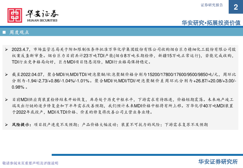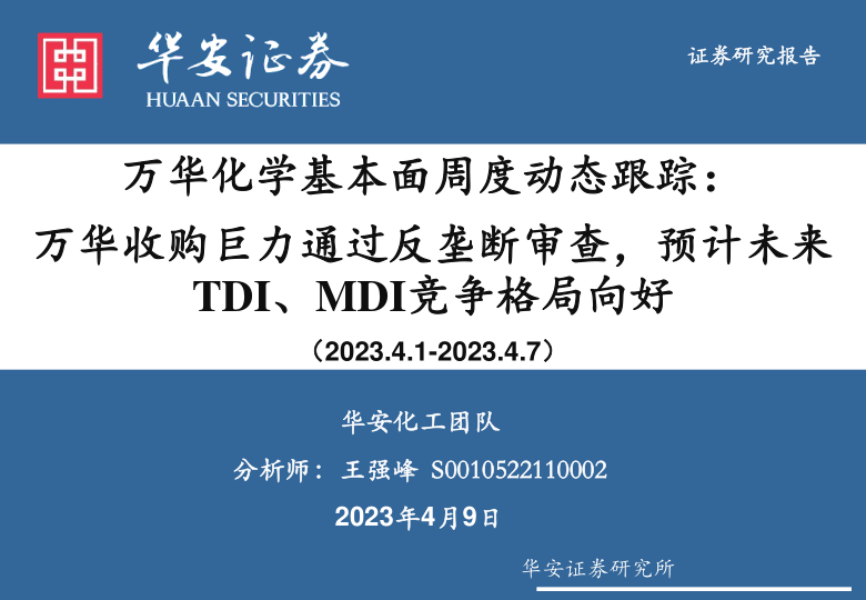 万华化学基本面周度动态跟踪:万华收购巨力通过反垄断审查,预计未来TDI、MDI竞争格局向好
