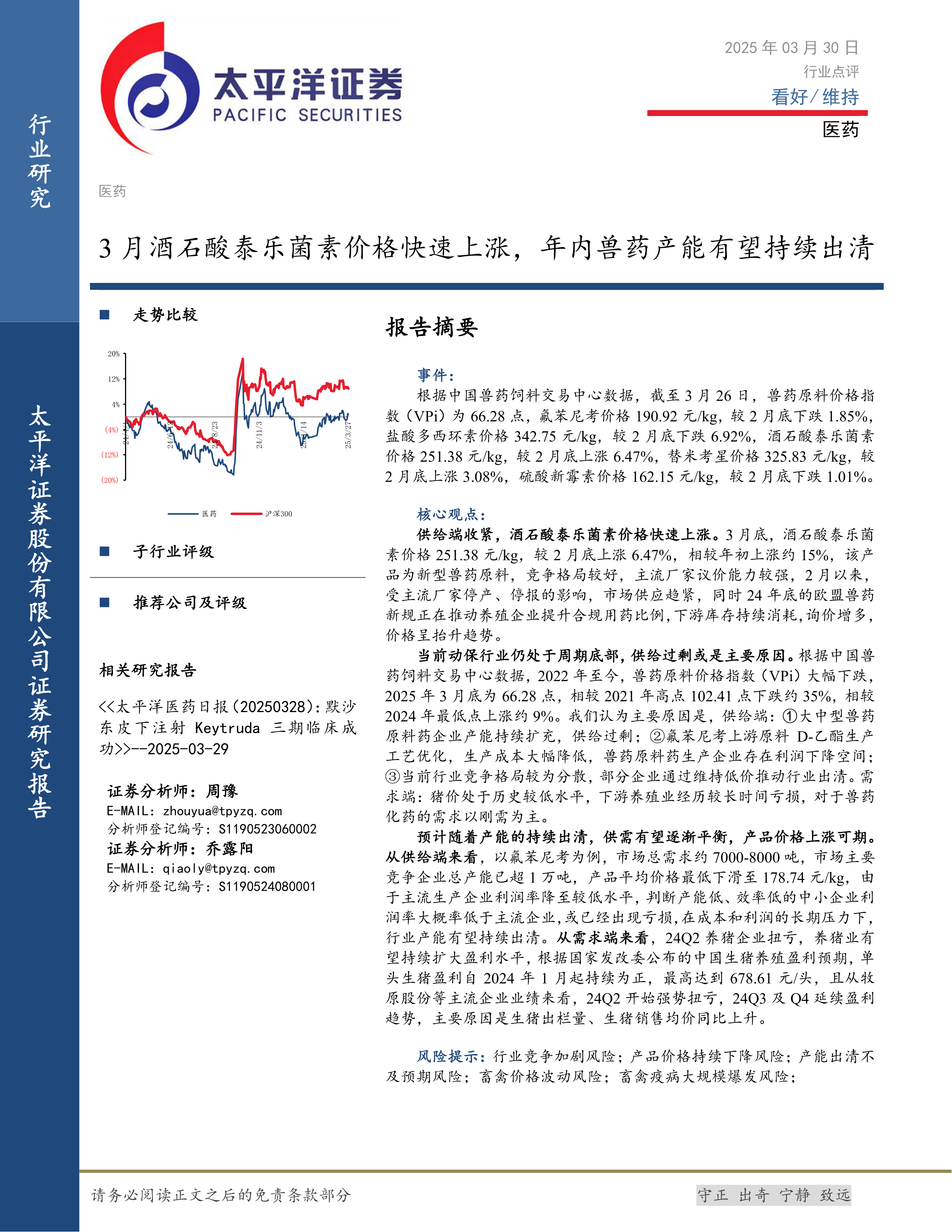 医药:3月酒石酸泰乐菌素价格快速上涨,年内兽药产能有望持续出清
