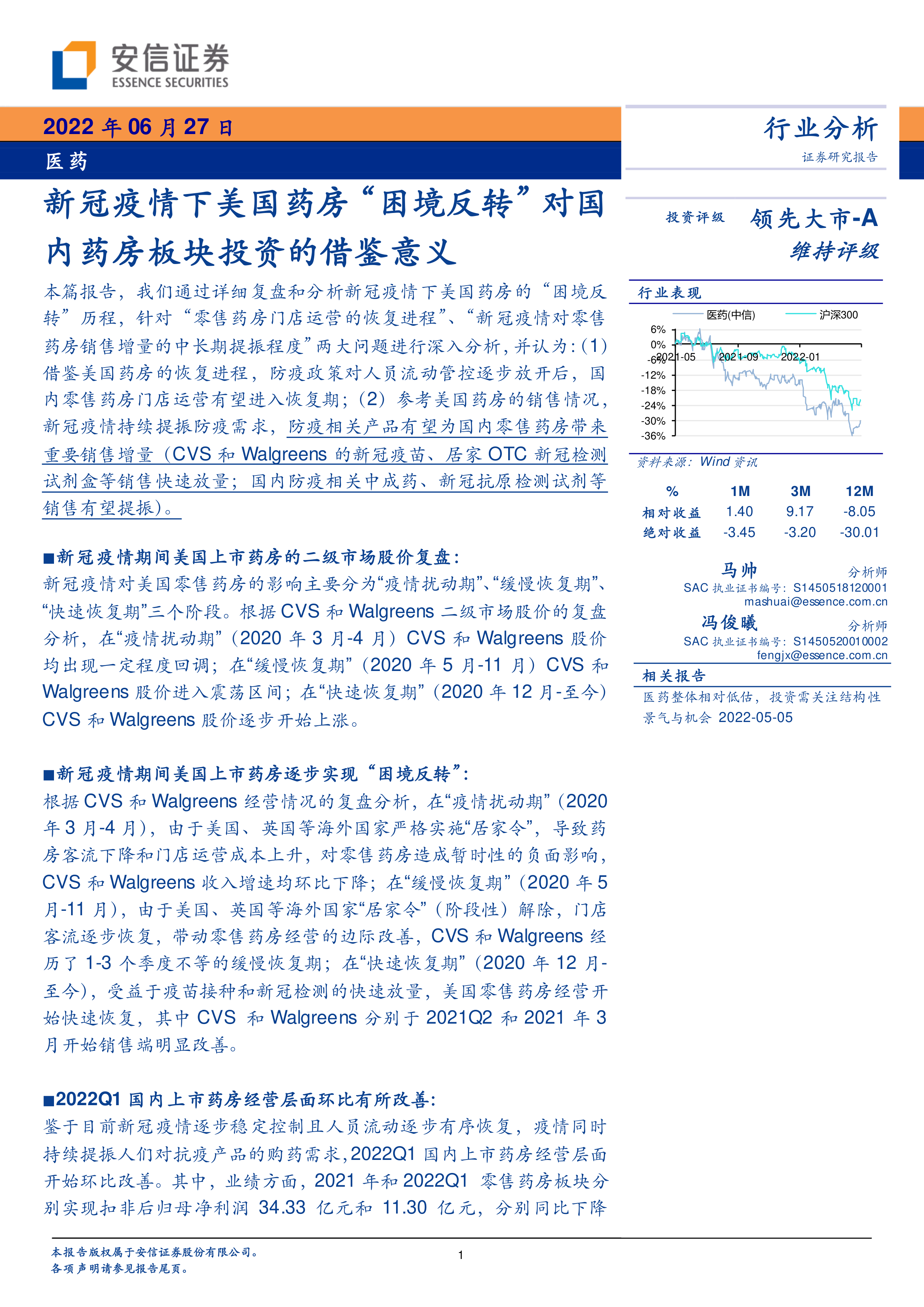 报告基于对美国药房经验的分析,对国内零售药房的经营前景做出积极判断,并指出国内药房在2022年第一季度已呈现环比改善的趋势。在此基础上,报告推荐了益丰药房、大参林、老百姓等重点投资标的,并建议关注一心堂、健之佳、漱玉平民。同时,报告也提示了包括疫情负面影响超预期、新零售业务冲击、门店扩张不及预期、行业竞争加剧、药品降价及处方外流等潜在风险。