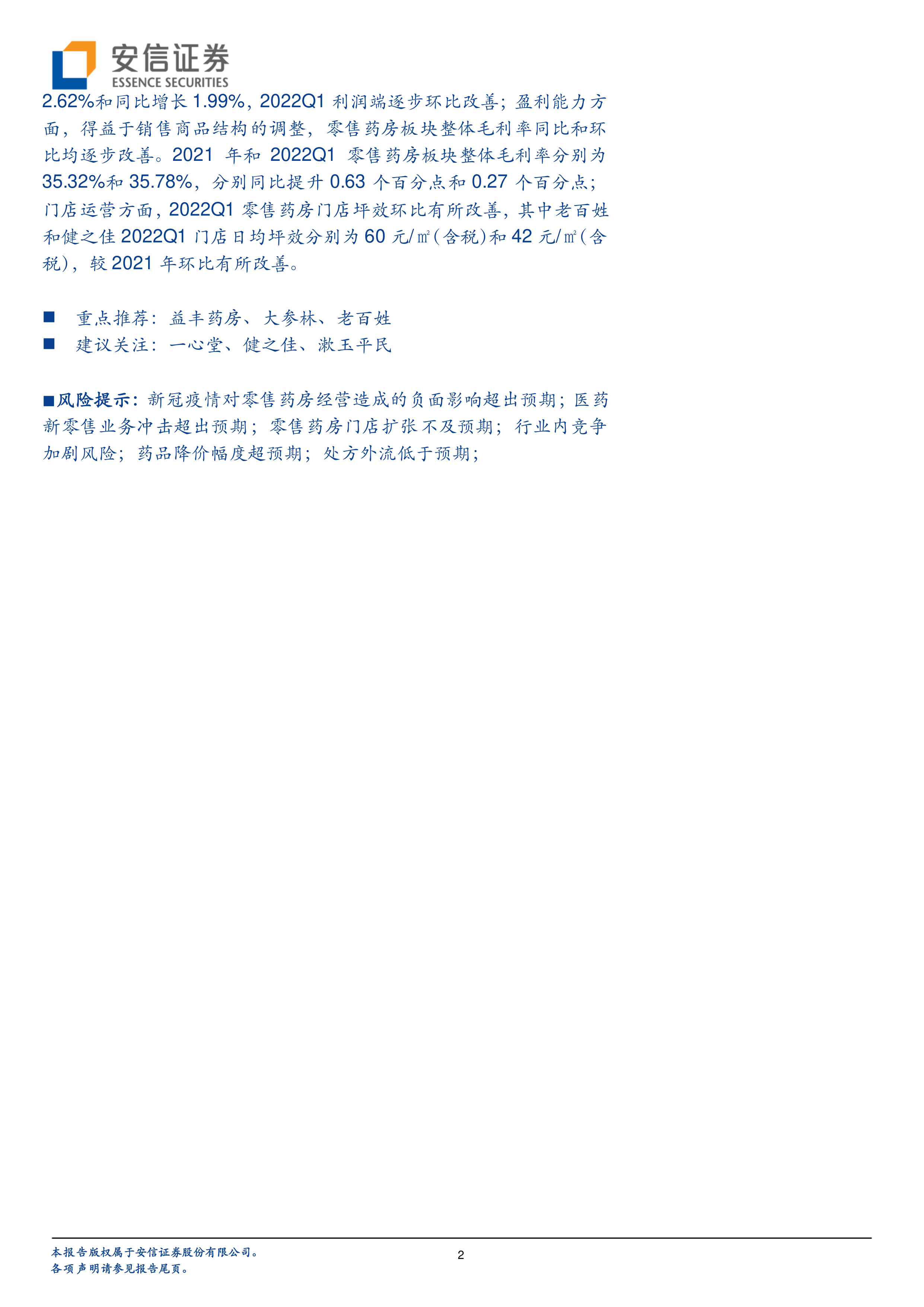 风险提示:新冠疫情对零售药房经营造成的负面影响超出预期;医药新零售业务冲击超出预期;零售药房门店扩张不及预期;行业内竞争加剧风险;药品降价幅度超预期;处方外流低于预期;