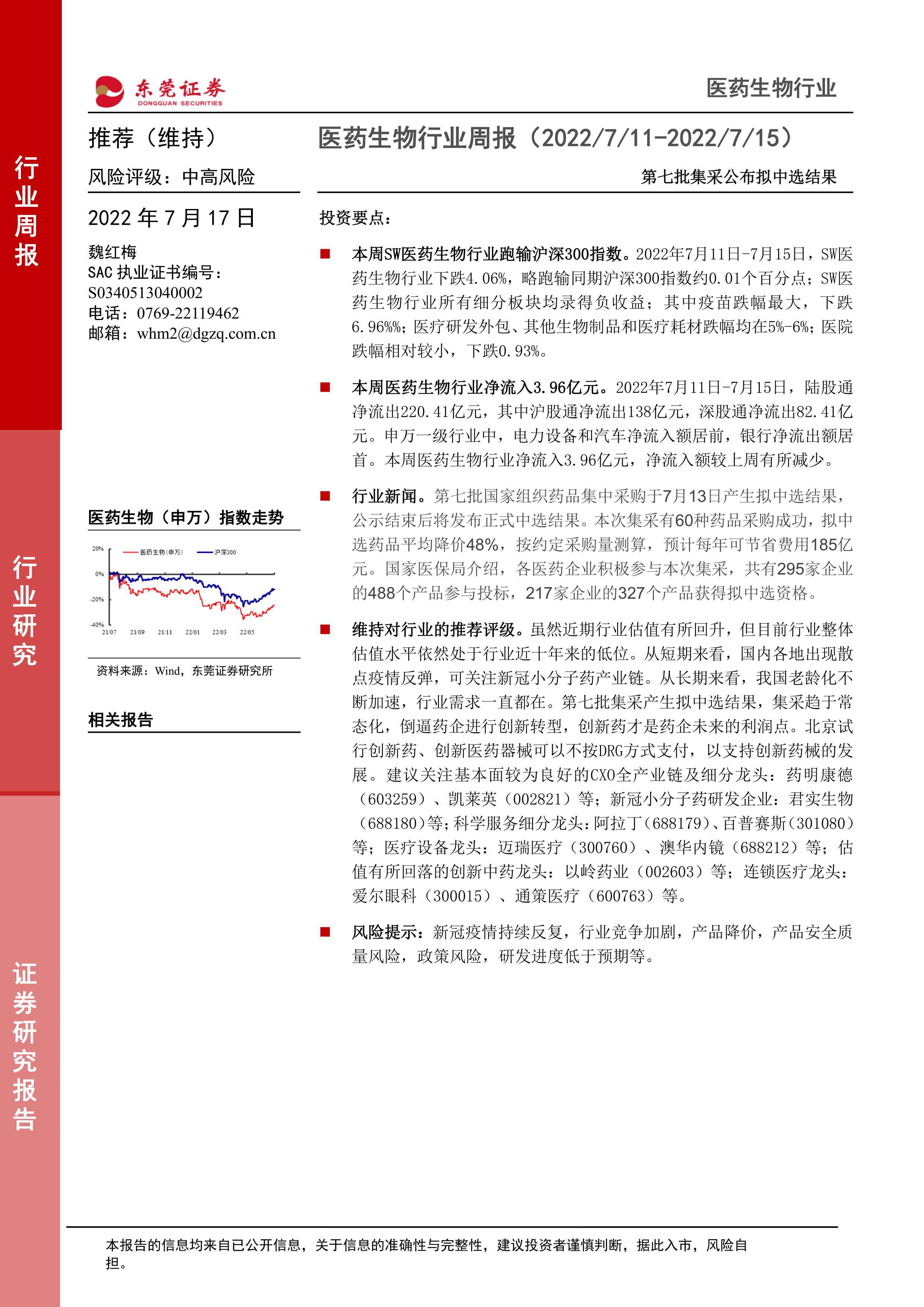 维持对行业的推荐评级。 虽然近期行业估值有所回升,但目前行业整体估值水平依然处于行业近十年来的低位。从短期来看,国内各地出现散点疫情反弹,可关注新冠小分子药产业链。从长期来看,我国老龄化不断加速,行业需求一直都在。第七批集采产生拟中选结果,集采趋于常态化,倒逼药企进行创新转型,创新药才是药企未来的利润点。北京试行创新药、创新医药器械可以不按DRG方式支付,以支持创新药械的发展。建议关注基本面较为良好的CXO全产业链及细分龙头:药明康德( 603259)、凯莱英( 002821)等;新冠小分子药研发企业:君实生物( 688180)等;科学服务细分龙头:阿拉丁( 688179)、百普赛斯( 301080)等;医疗设备龙头:迈瑞医疗( 300760)、澳华内镜( 688212)等;估值有所回落的创新中药龙头:以岭药业( 002603)等;连锁医疗龙头:爱尔眼科( 300015)、通策医疗( 600763)等。