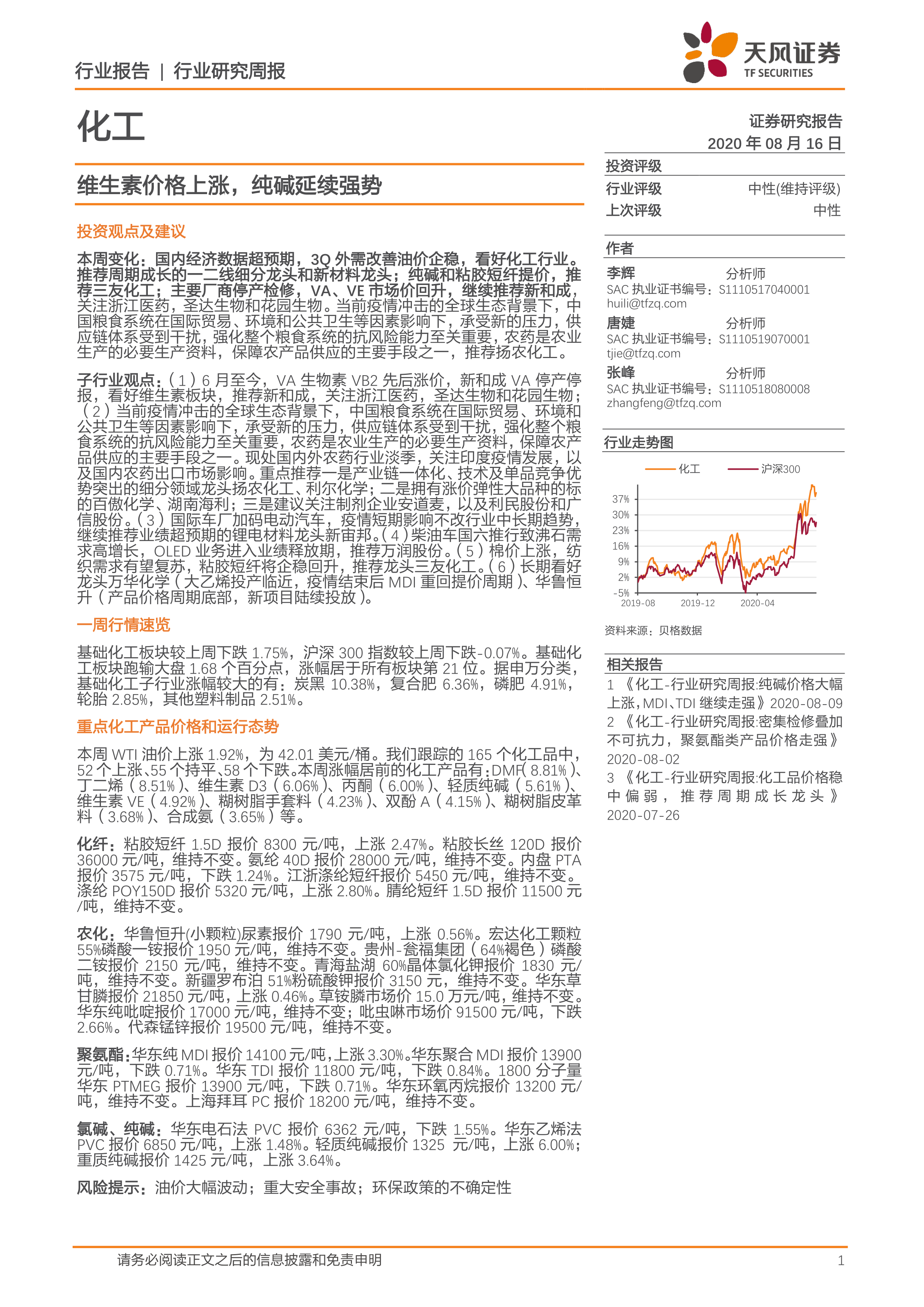 化工行业研究周报:维生素价格上涨,纯碱延续强势