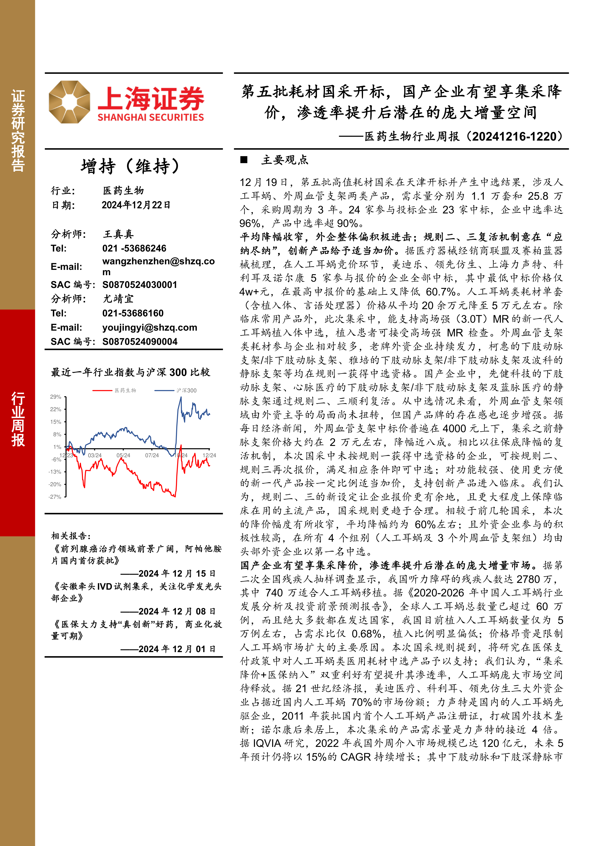 本报告主要围绕第五批耗材国采开标结果,对人工耳蜗和外周血管支架两类产品的中选情况、降价幅度、市场影响以及国产企业的机遇进行了深入分析。