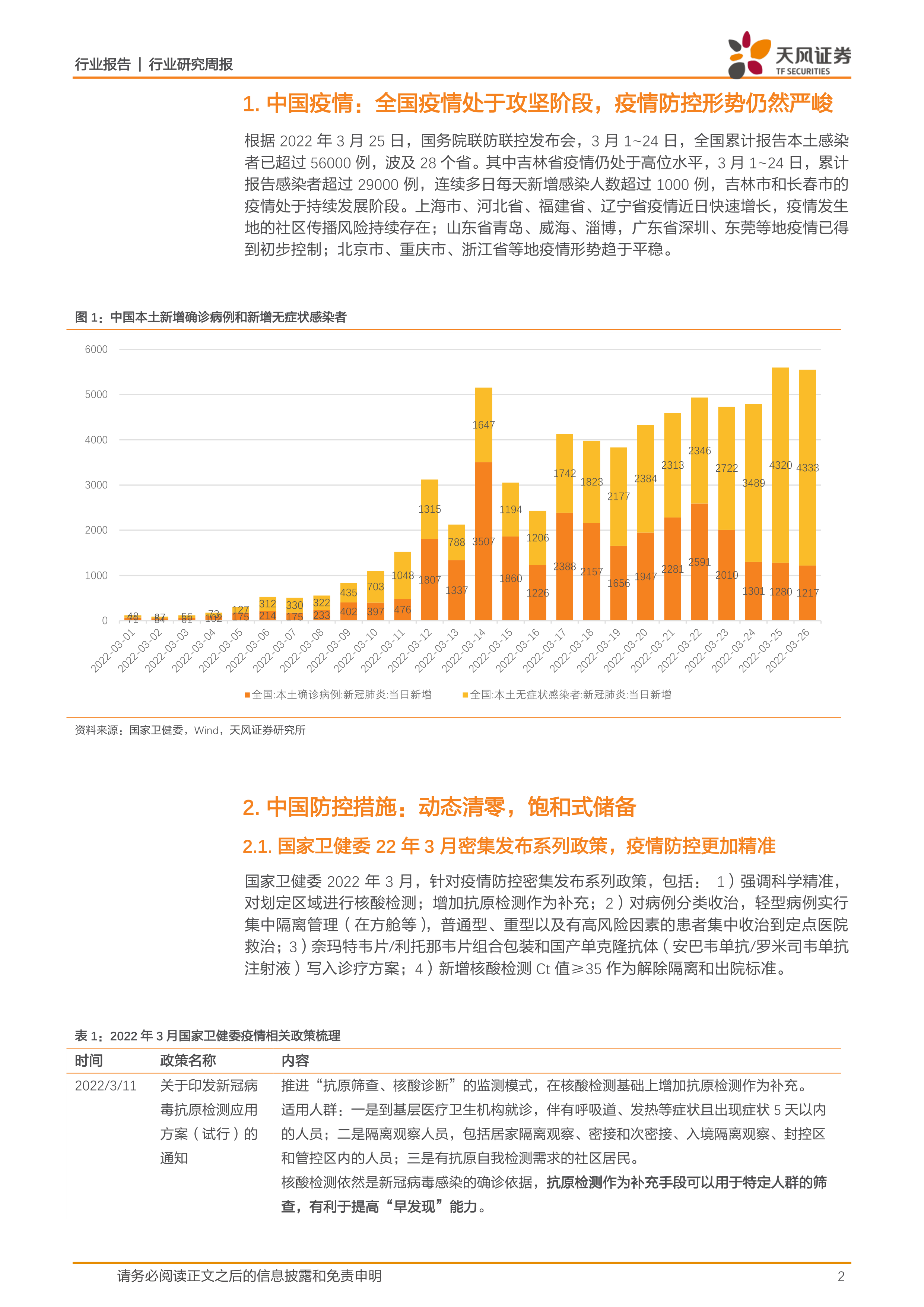 国家卫健委2022年3月发布系列政策,仍为“动态清零”,但更加精准,包括:1)强调科学精准,对划定区域进行核酸检测;增加抗原检测作为补充;2)对病例分类收治,轻型病例实行集中隔离管理(在方舱等),普通型、重型以及有高风险因素的患者集中收治到定点医院救治;3)奈玛特韦片/利托那韦片组合包装和国产单克隆抗体(安巴韦单抗/罗米司韦单抗注射液)写入诊疗方案;4)新增核酸检测Ct值≥35作为解除隔离和出院标准。