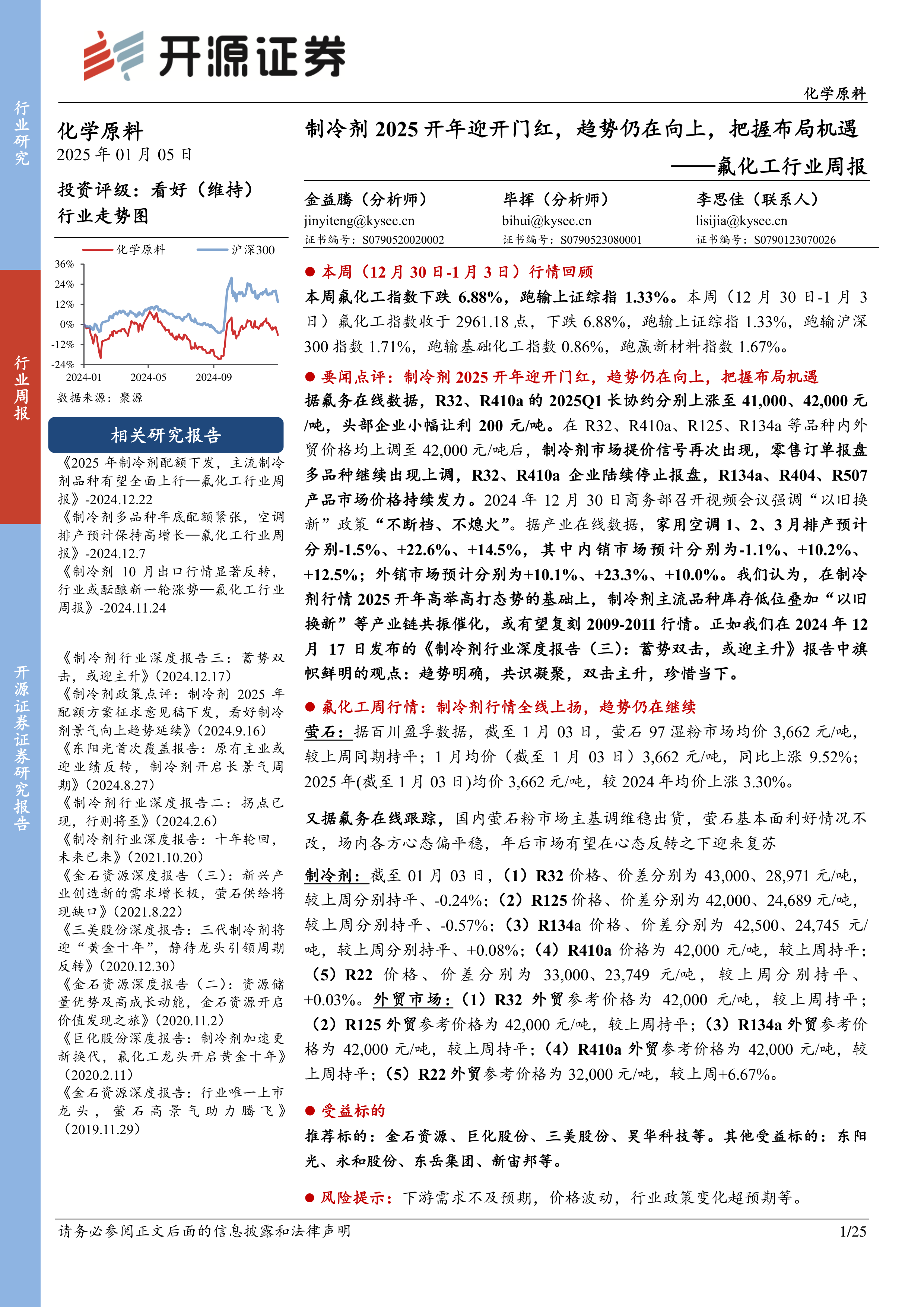 氟化工行业周报:制冷剂2025开年迎开门红,趋势仍在向上,把握布局机遇