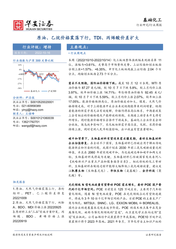 基础化工行业周报:原油、乙烷价格震荡下行,TDI、丙烯酸价差扩大