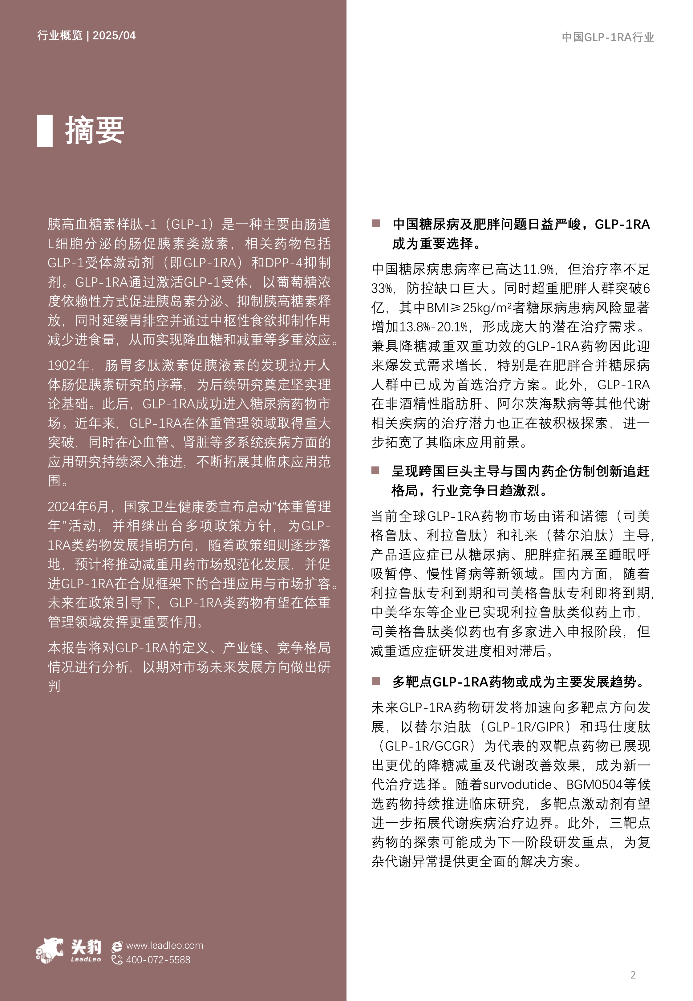 中国GLP-1RA行业正处于快速发展期,其在糖尿病和肥胖症治疗中的核心地位日益凸显,并持续向多系统代谢疾病领域拓展。在国家政策支持和市场需求的双重驱动下,行业规模预计将实现显著增长。尽管当前市场由诺和诺德和礼来等跨国巨头主导,但国内药企正通过仿制药的快速上市和创新药的积极研发奋力追赶。未来,多靶点、长效化和口服化将成为GLP-1RA药物研发的主要趋势,具备差异化临床价值和创新技术的产品将在激烈的市场竞争中占据优势。华东医药等国内企业通过“仿创结合”策略,有望在市场中占据一席之地,推动中国GLP-1RA行业的持续创新与发展。