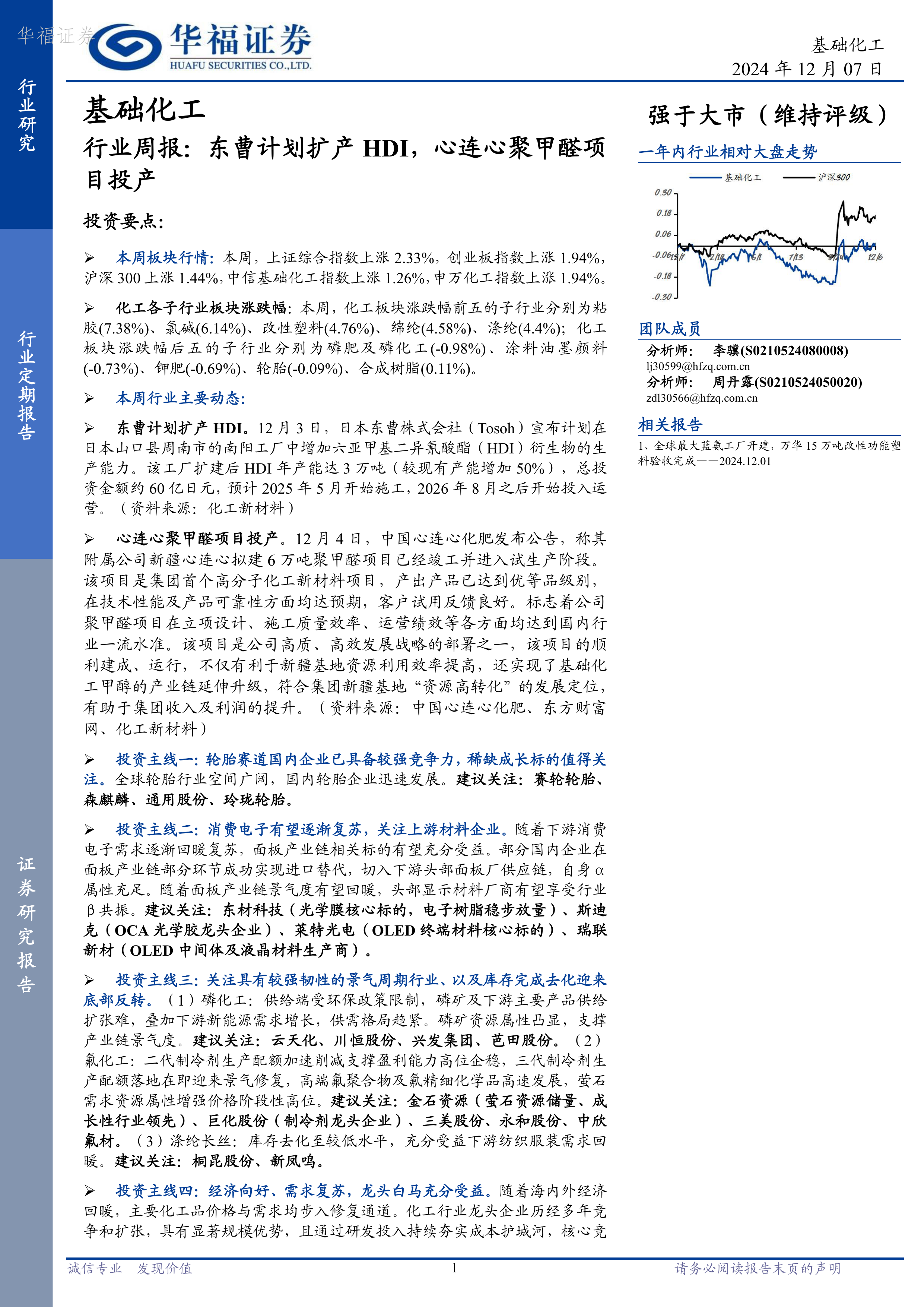 基础化工行业周报:东曹计划扩产HDI,心连心聚甲醛项目投产