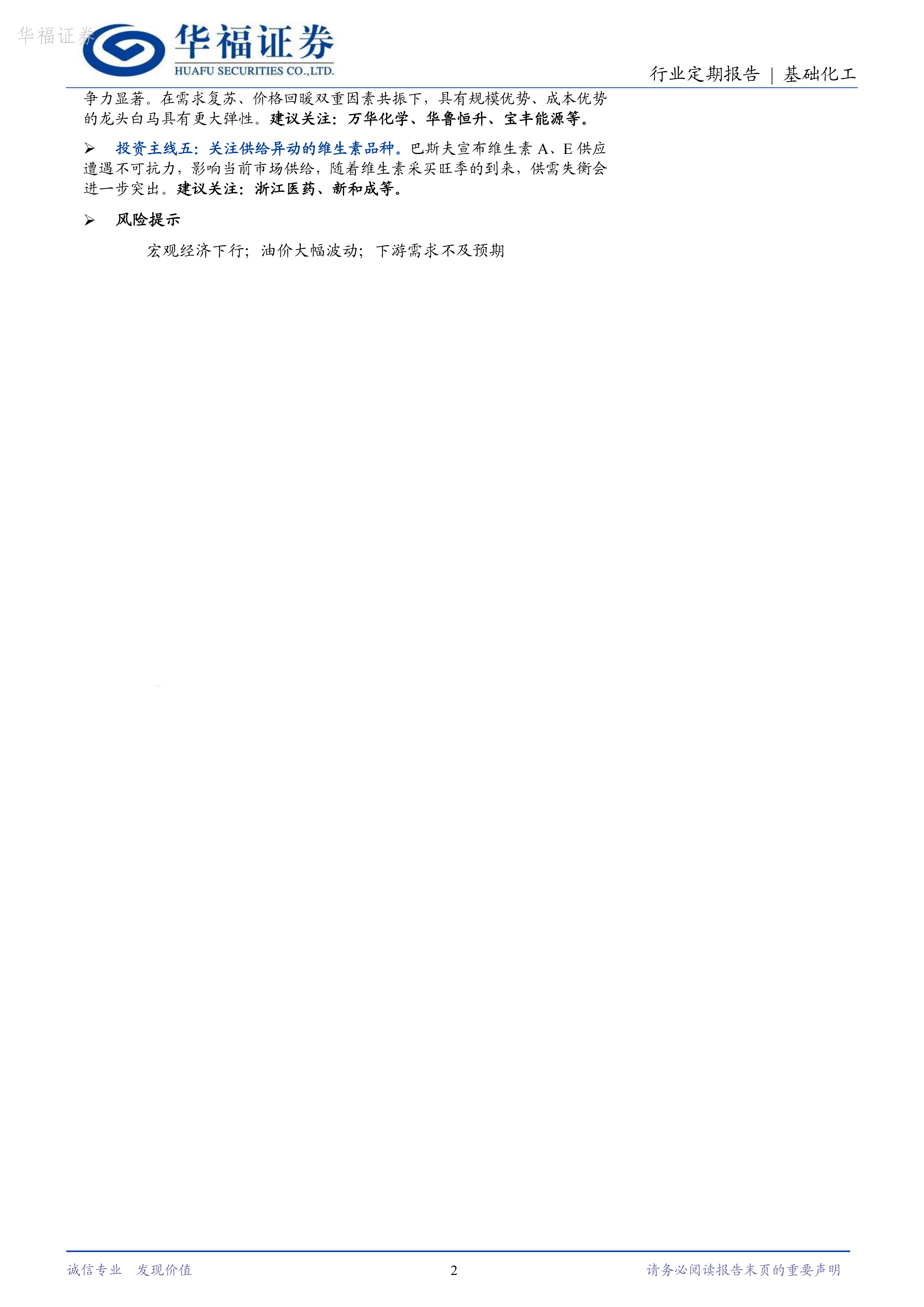 投资主线五:关注供给异动的维生素品种。巴斯夫宣布维生素A、E供应遭遇不可抗力,影响当前市场供给,随着维生素采买旺季的到来,供需失衡会进一步突出。建议关注:浙江医药、新和成等。