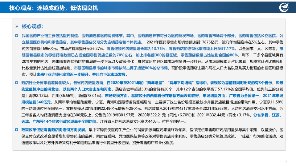 本报告核心观点指出,中国药店行业正经历显著的连锁化转型,零售连锁药店数量和市场份额持续增长,连锁化率已达57.17%,并预计将进一步提升。在这一趋势下,医药商业板块的估值目前处于历史较低水平,为投资者提供了良好的布局机会。
