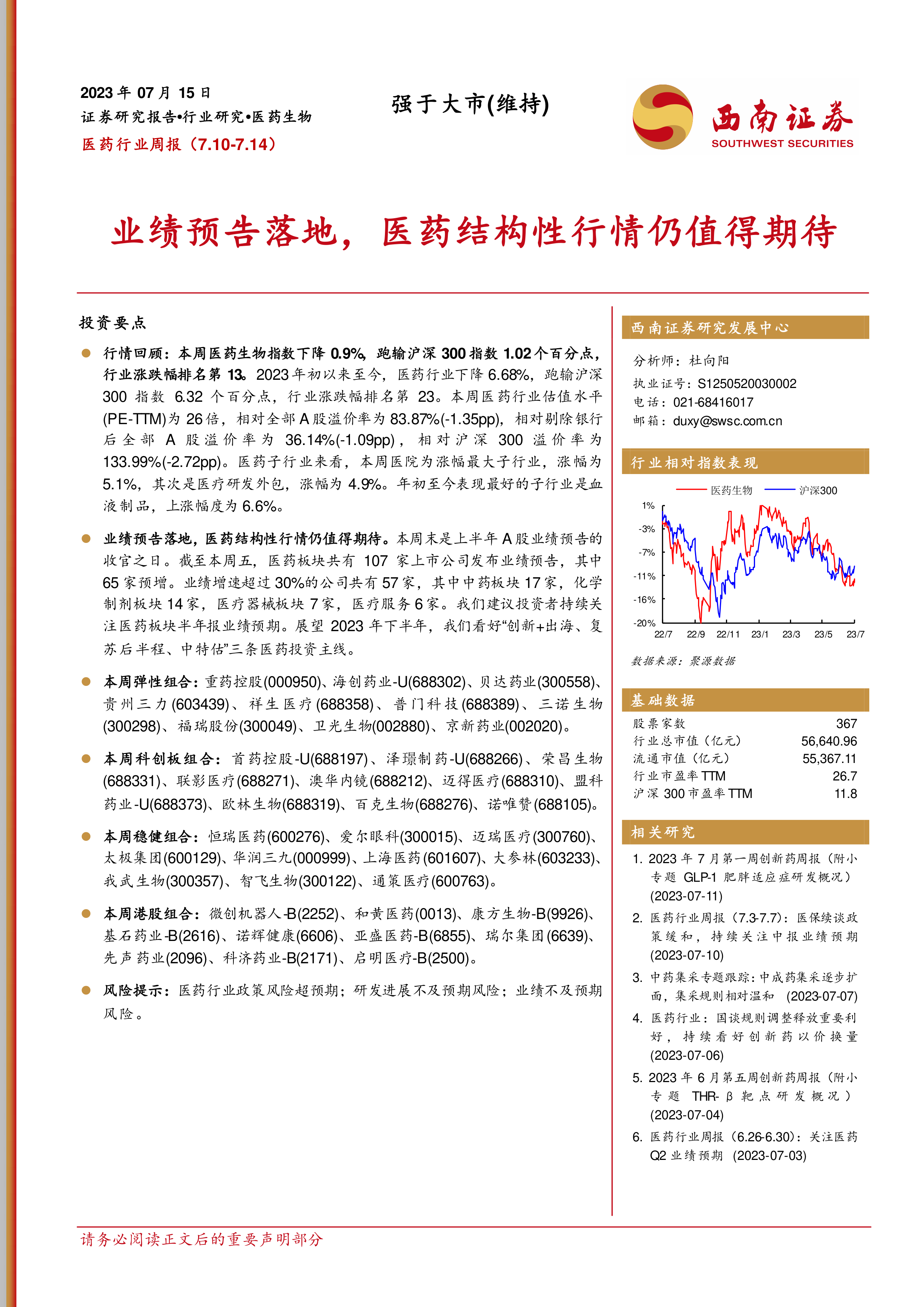 业绩预告落地,医药结构性行情仍值得期待。本周末是上半年A股业绩预告的收官之日。截至本周五,医药板块共有107家上市公司发布业绩预告,其中65家预增。业绩增速超过30%的公司共有57家,其中中药板块17家,化学制剂板块14家,医疗器械板块7家,医疗服务6家。我们建议投资者持续关注医药板块半年报业绩预期。展望2023年下半年,我们看好“创新+出海、复苏后半程、中特估”三条医药投资主线。