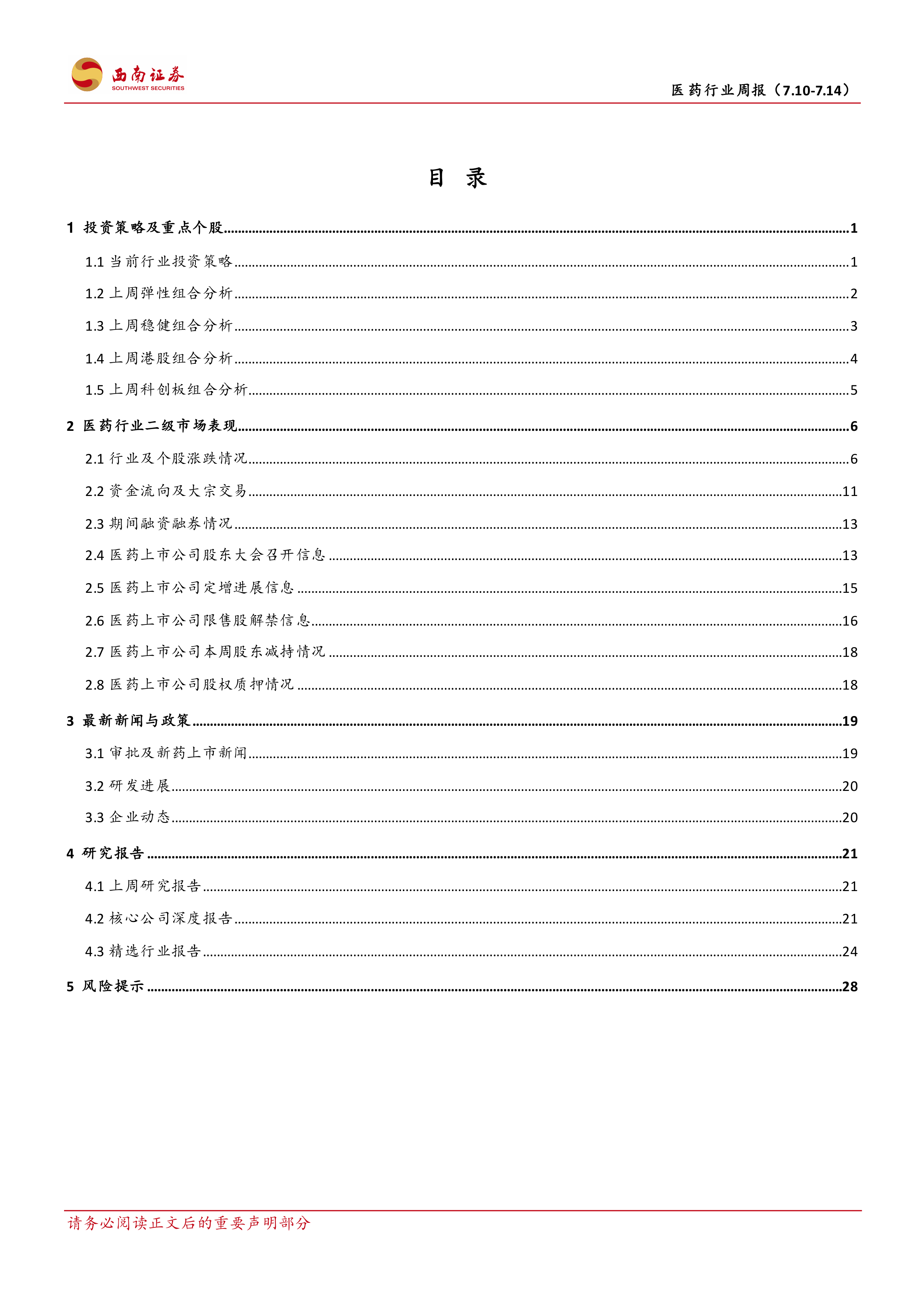 风险提示:医药行业政策风险超预期;研发进展不及预期风险;业绩不及预期风险。