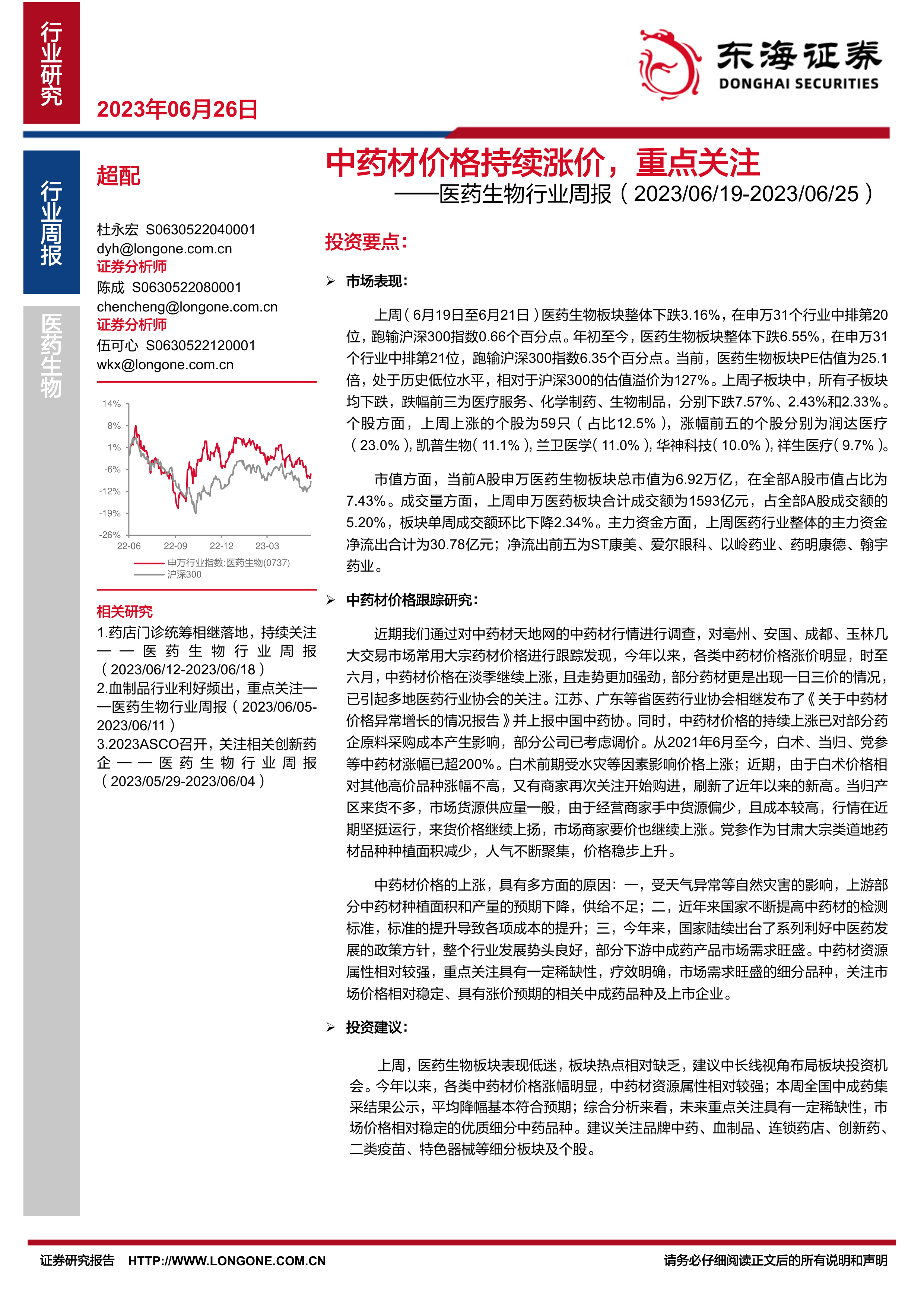 医药生物行业周报:中药材价格持续涨价,重点关注