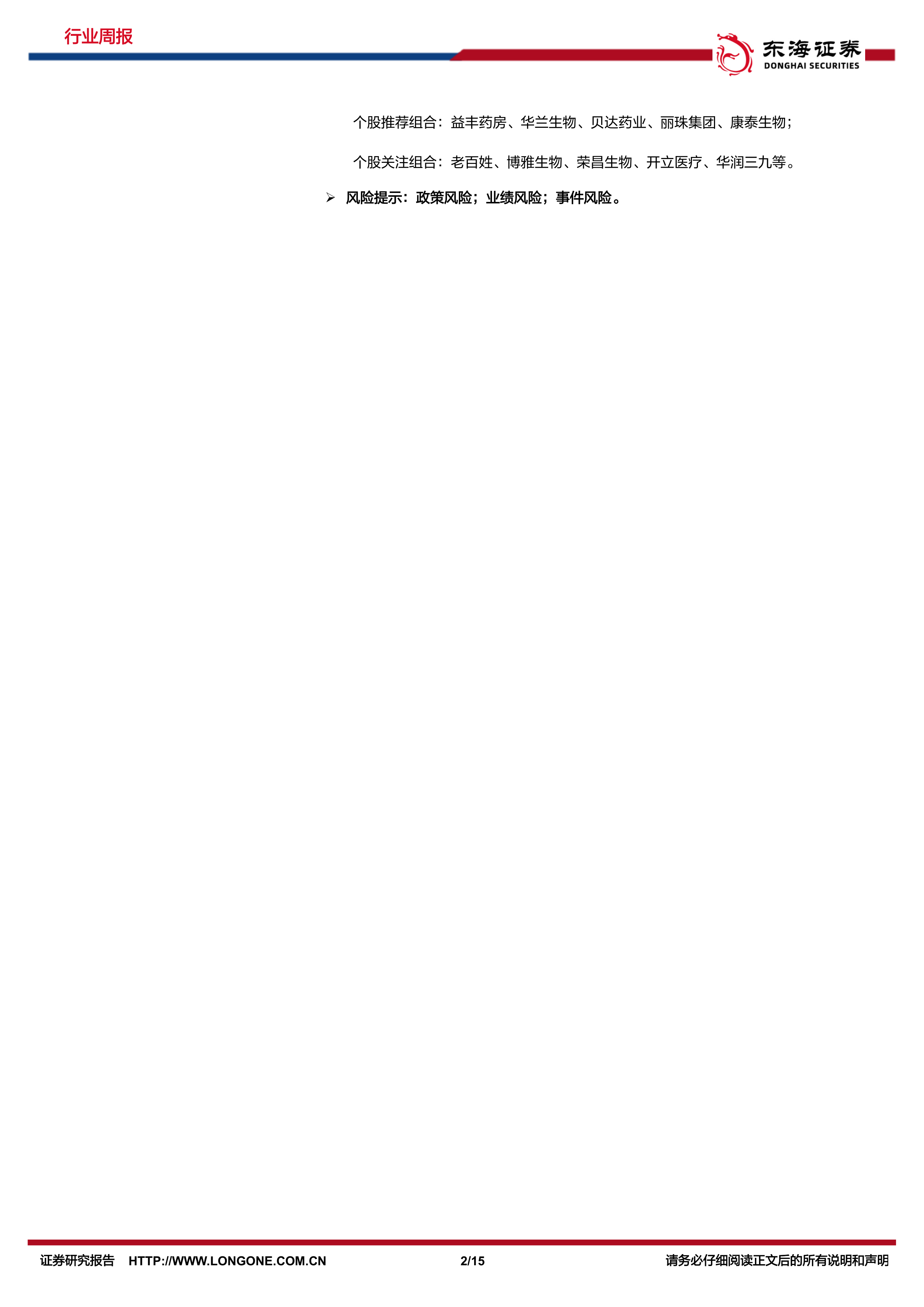 个股推荐组合:益丰药房、华兰生物、贝达药业、丽珠集团、康泰生物;