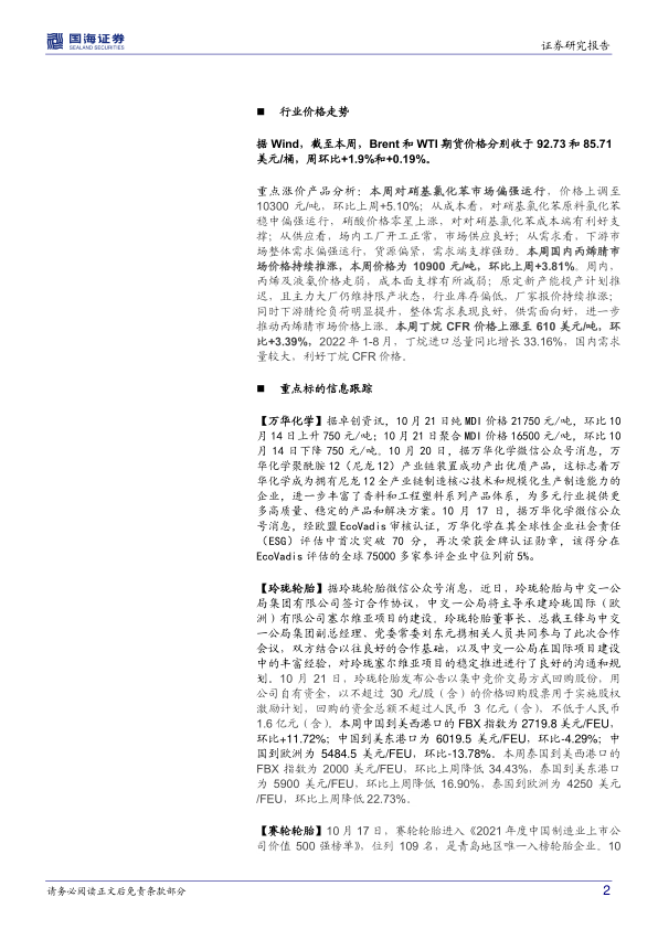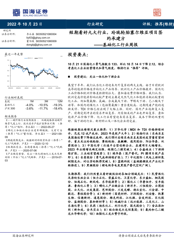 根据短期业绩情况重点推荐:1)万华化学(MDI和TDI价格持续回升,尼龙12试产成功,2023年是投产大年);2)轮胎行业(东南亚至美国海运费下降接近底部,我们预计后续东南亚至美国的发货量有望回升,重点关注玲珑轮胎、赛轮轮胎、森麒麟、通用股份、阳谷华泰、双箭股份);3)中国化学(打造平台型创新企业,在建项目大幅增长,2023年业绩增长确定性强,短期己二腈突破);4)合盛硅业(下游持续扩张,工业硅有望趋紧);5)瑞华泰(国产替代,PI膜项目投产在即);6)长青股份(景气底部持续扩张);7)中化国际(风电上游环氧树脂龙头,对位芳纶取得突破)。8)蓝晓科技(盐湖提锂技术产业化不断推进)。9)黑猫股份(锂电级导电炭黑国产替代空间广阔)。