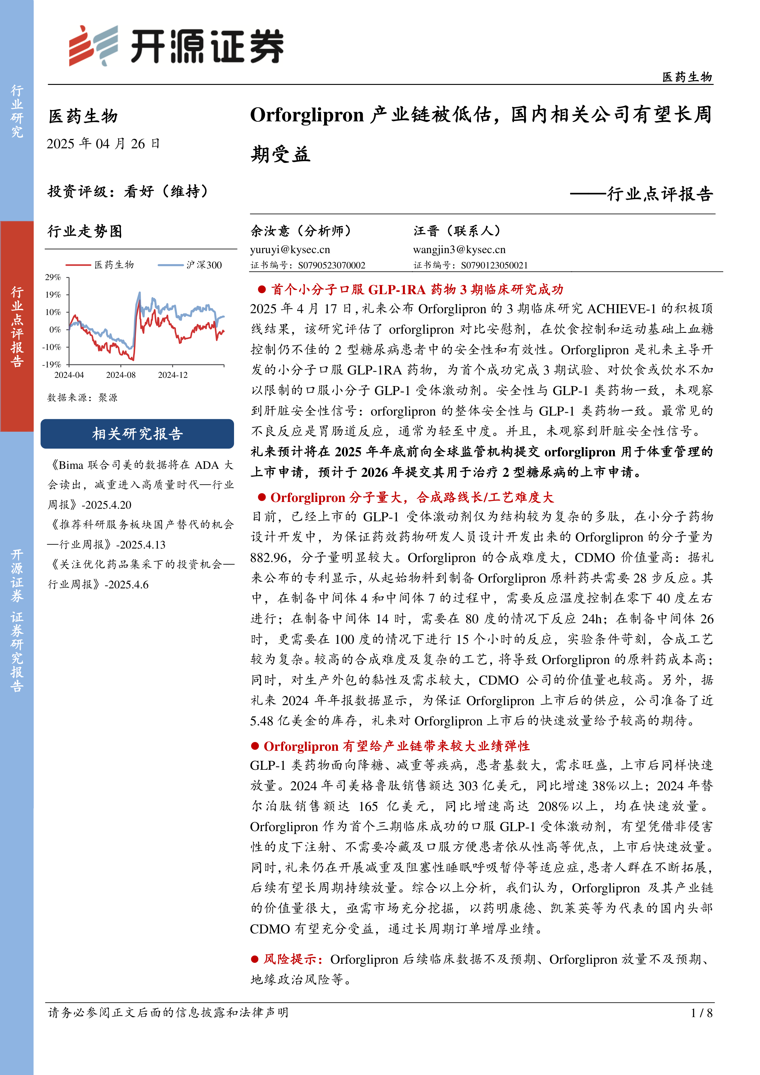GLP-1类药物面向降糖、减重等疾病,患者基数大,需求旺盛,上市后同样快速放量。2024年司美格鲁肽销售额达303亿美元,同比增速38%以上;2024年替尔泊肽销售额达165亿美元,同比增速高达208%以上,均在快速放量。Orforglipron作为首个三期临床成功的口服GLP-1受体激动剂,有望凭借非侵害性的皮下注射、不需要冷藏及口服方便患者依从性高等优点,上市后快速放量。同时,礼来仍在开展减重及阻塞性睡眠呼吸暂停等适应症,患者人群在不断拓展,后续有望长周期持续放量。综合以上分析,我们认为,Orforglipron及其产业链的价值量很大,亟需市场充分挖掘,以药明康德、凯莱英等为代表的国内头部CDMO有望充分受益,通过长周期订单增厚业绩。