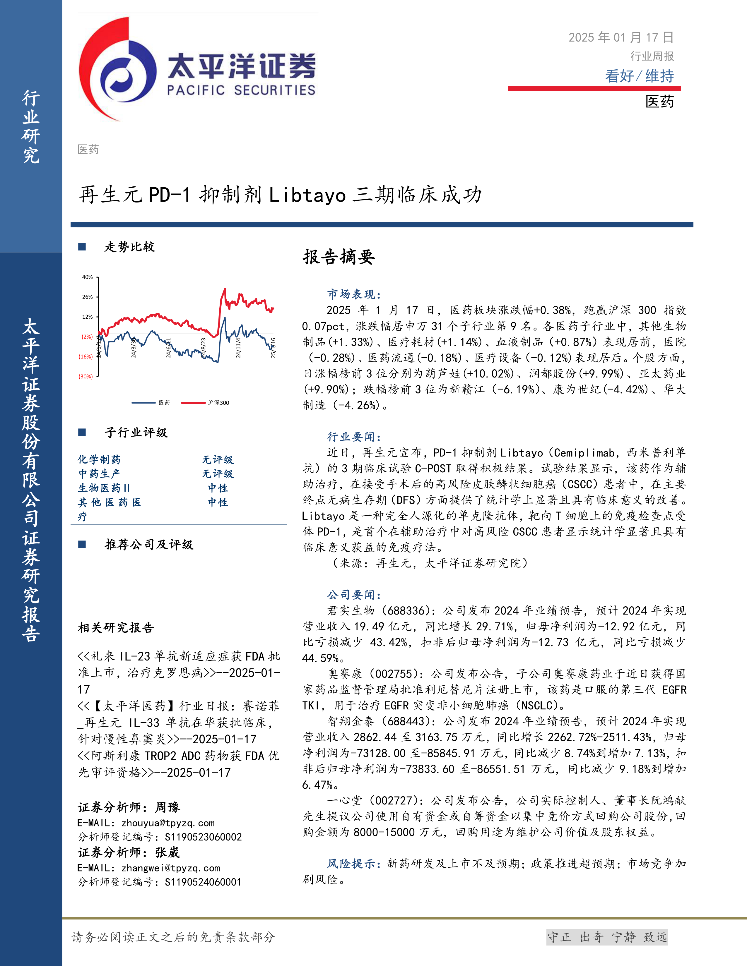 本报告对医药行业维持看好评级,并分析了近期行业动态及重点公司公告。报告强调了再生元PD-1抑制剂Libtayo三期临床的成功,预示着肿瘤免疫治疗的潜在进展。同时,报告也关注了君实生物、奥赛康、智翔金泰、一心堂等公司的业绩预告及经营动态,反映了医药企业在创新药研发、业绩增长和股东回报等方面的积极举措。