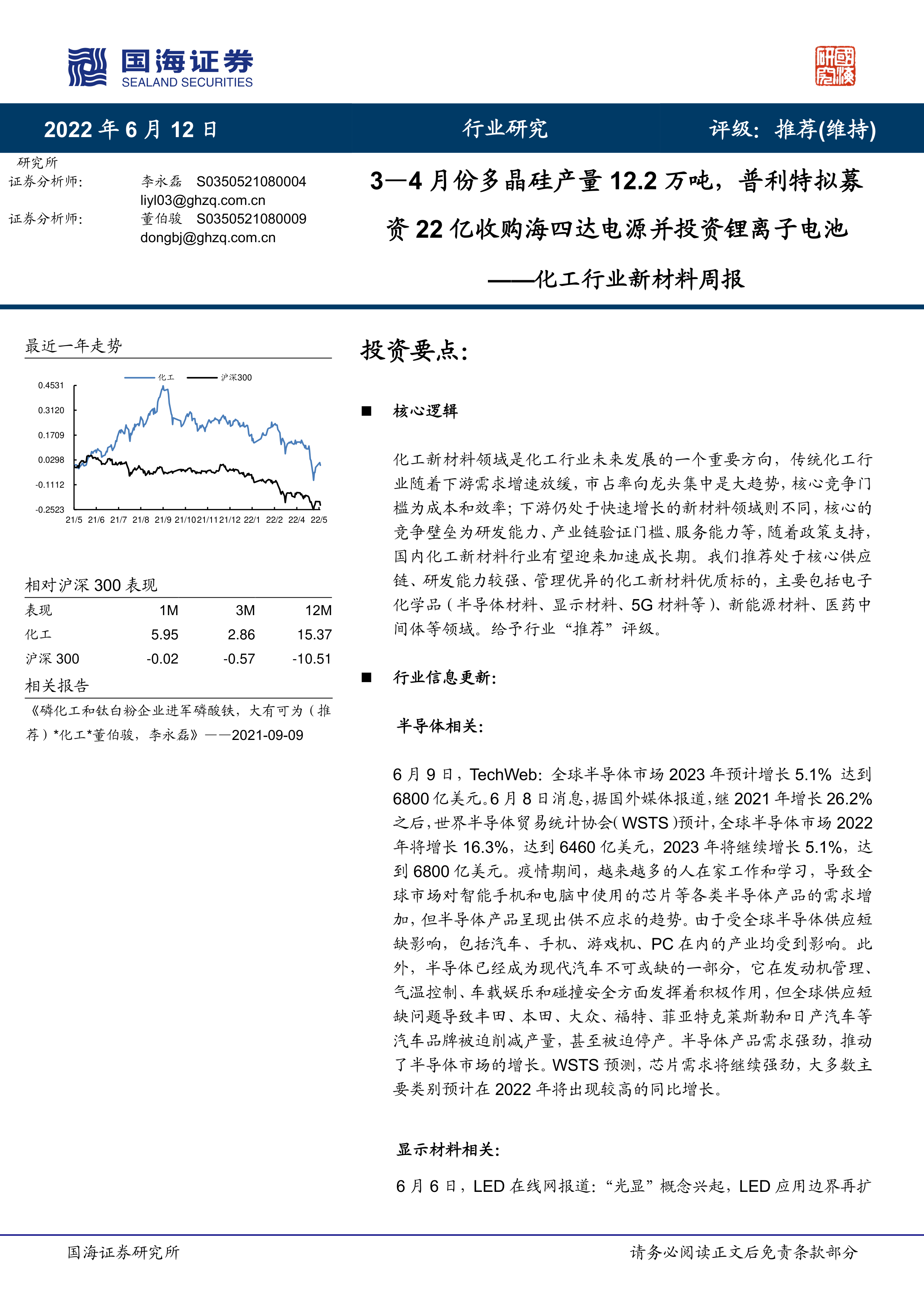 化工行业新材料周报:3—4月份多晶硅产量12.2万吨,普利特拟募资22亿收购海四达电源并投资锂离子电池