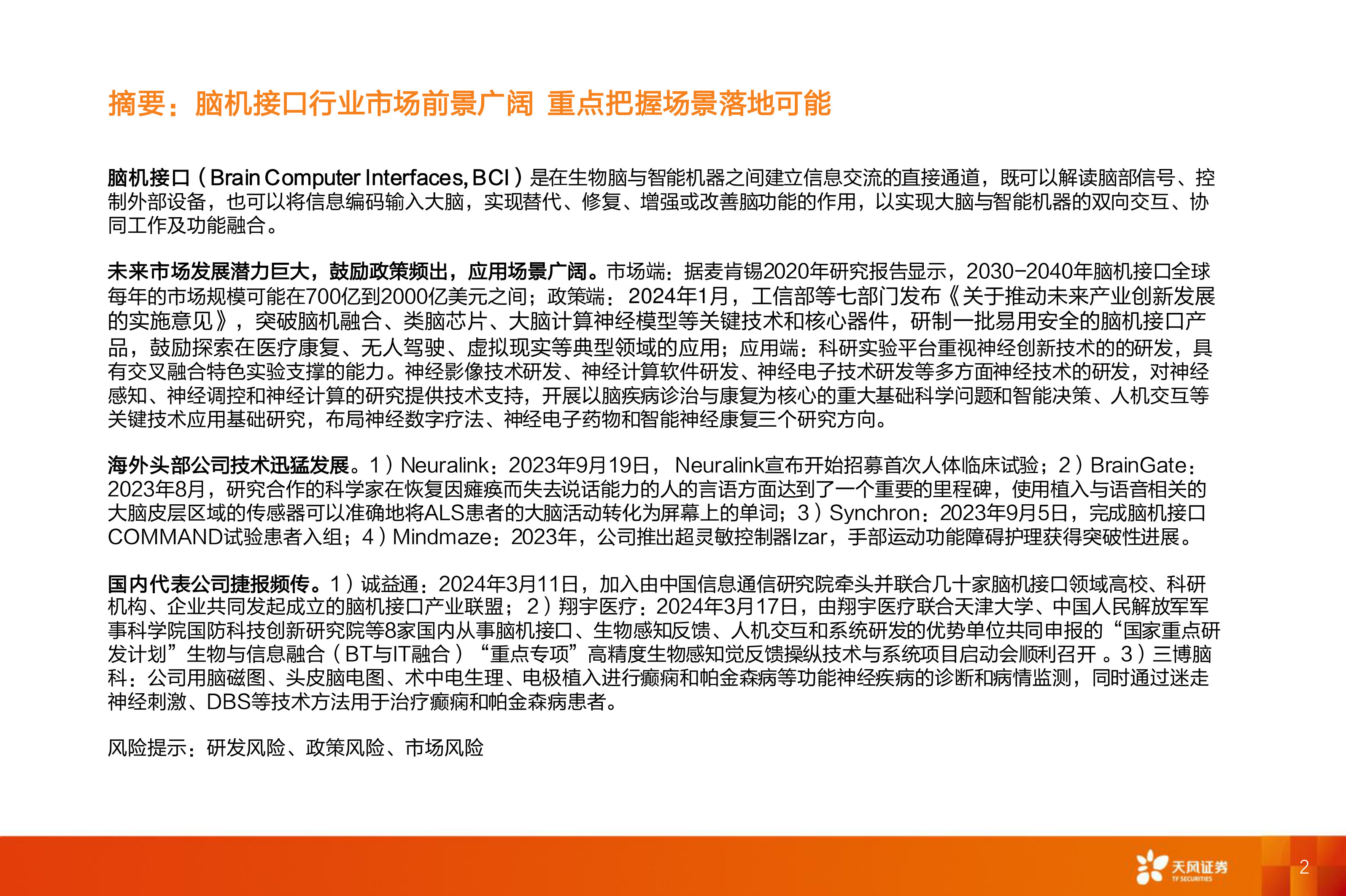 国内代表公司捷报频传。1)诚益通:2024年3月11日,加入由中国信息通信研究院牵头并联合几十家脑机接口领域高校、科研机构、企业共同发起成立的脑机接口产业联盟;2)翔宇医疗:2024年3月17日,由翔宇医疗联合天津大学、中国人民解放军军事科学院国防科技创新研究院等8家国内从事脑机接口、生物感知反馈、人机交互和系统研发的优势单位共同申报的“国家重点研发计划”生物与信息融合(BT与IT融合)“重点专项”高精度生物感知觉反馈操纵技术与系统项目启动会顺利召开。3)三博脑科:公司用脑磁图、头皮脑电图、术中电生理、电极植入进行癫痫和帕金森病等功能神经疾病的诊断和病情监测,同时通过迷走神经刺激、DBS等技术方法用于治疗癫痫和帕金森病患者。
