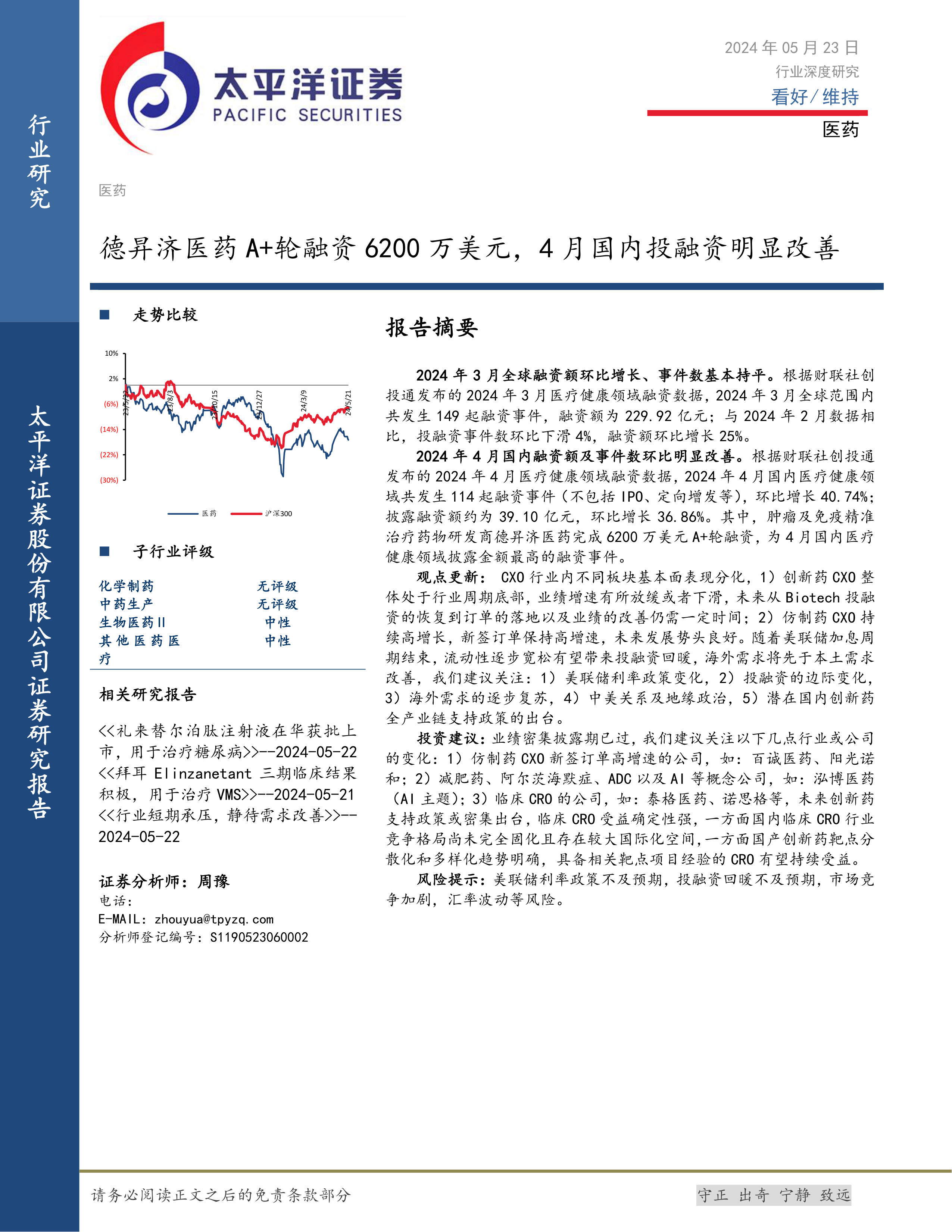 医药行业深度研究:德昇济医药A+轮融资6200万美元,4月国内投融资明显改善