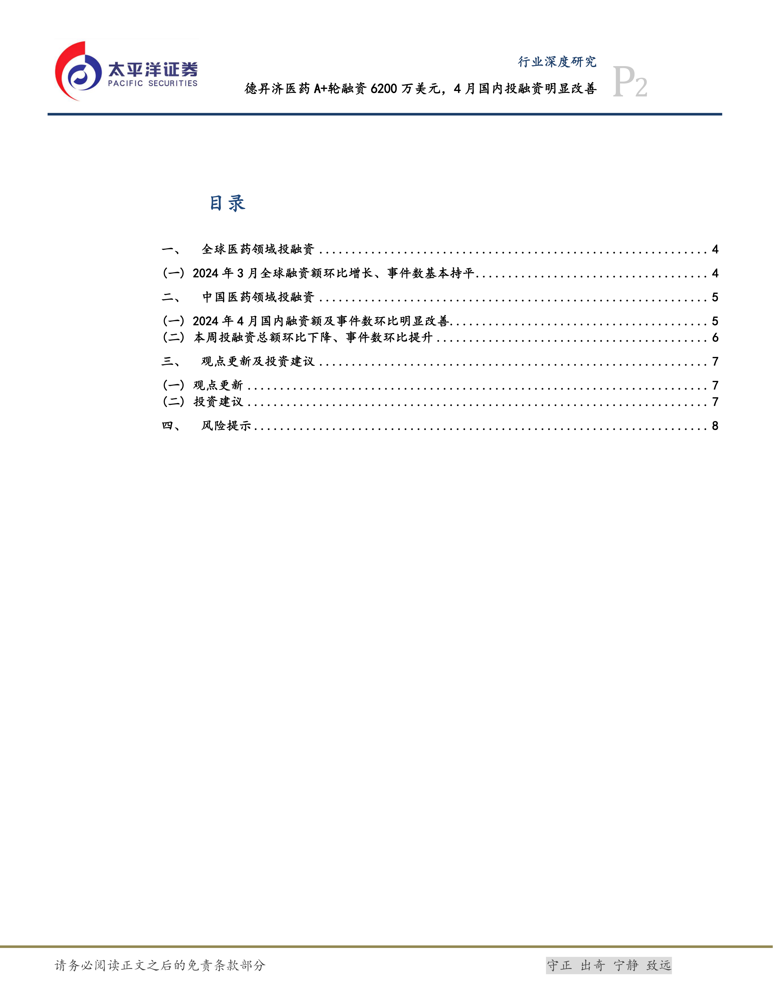 本报告对医药行业的投融资情况进行了分析,指出全球医药融资额在2024年3月有所增长,而国内医药领域在4月经历了显著的融资额和事件数增长。报告强调CXO行业内部的分化,并建议投资者关注仿制药CXO、创新概念公司以及临床CRO等细分领域。同时,报告也提示了美联储利率政策、投融资回暖、市场竞争和汇率波动等风险。