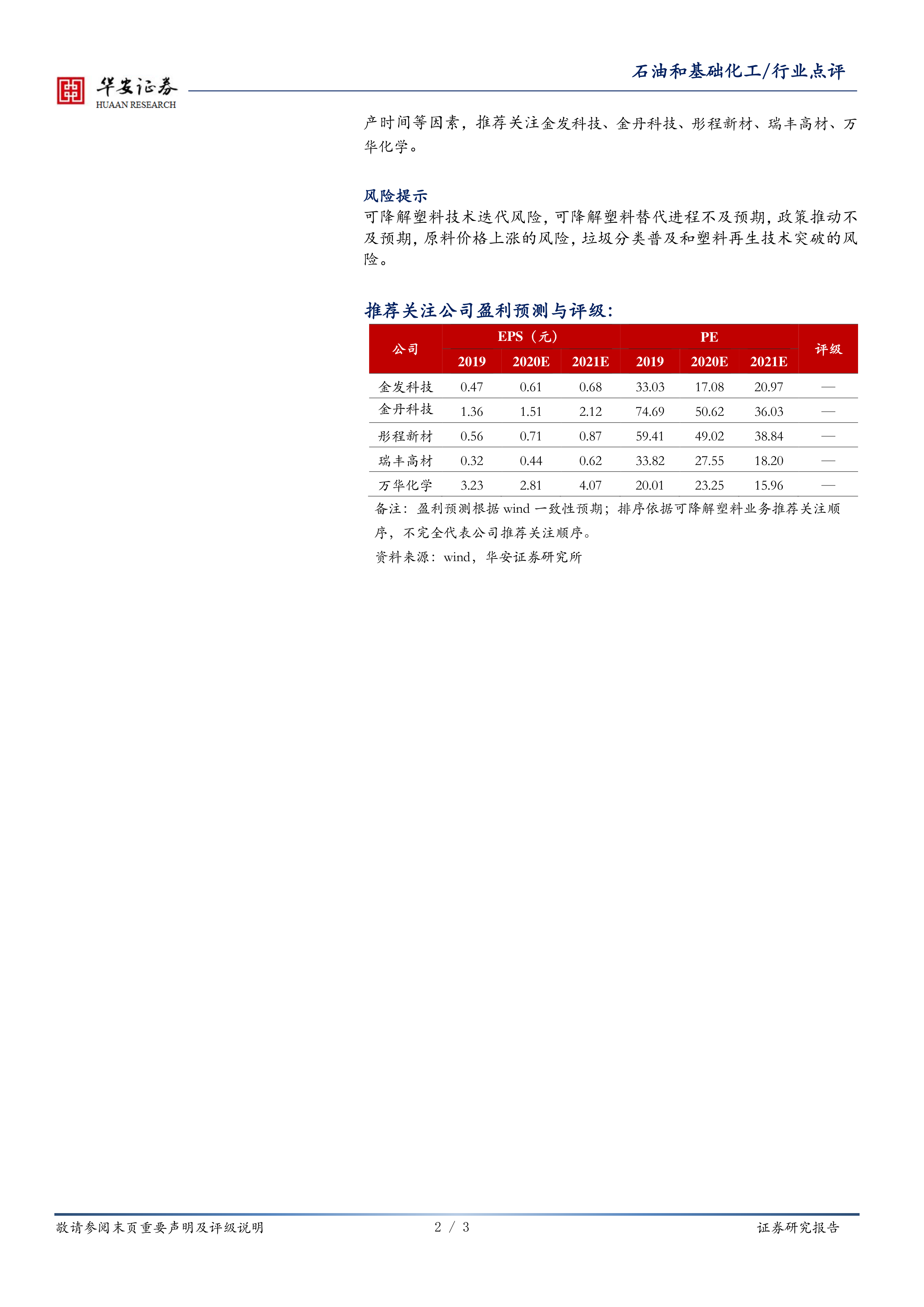 本报告分析了国家禁塑政策的进一步加码对石油和基础化工行业的影响。通过细化执行标准,禁止生产多种不可降解塑料制品,从源头禁塑。各地加强日常监督,开展塑料垃圾专项清理,从下游禁塑。可降解塑料产能迅速扩张,行业呈现高景气。报告推荐关注金发科技、金丹科技、彤程新材、瑞丰高材、万华化学等公司,并提示了可降解塑料技术迭代、替代进程、政策推动、原料价格及再生技术等风险。