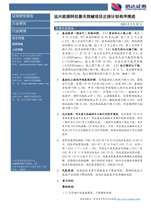 化工行业周报:远兴能源阿拉善天然碱项目正按计划有序推进