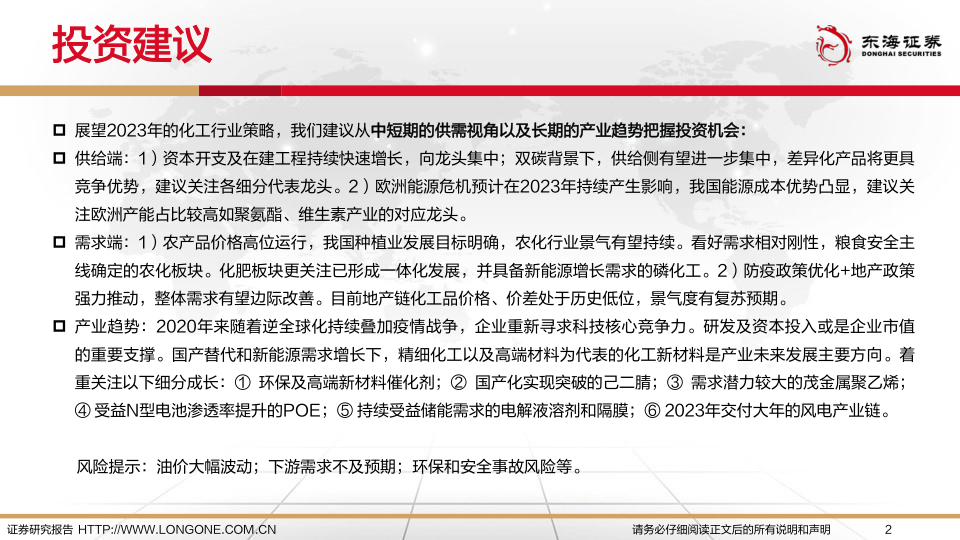 展望2023年的化工行业策略,我们建议从中短期的供需视角以及长期的产业趋势把握投资机会: