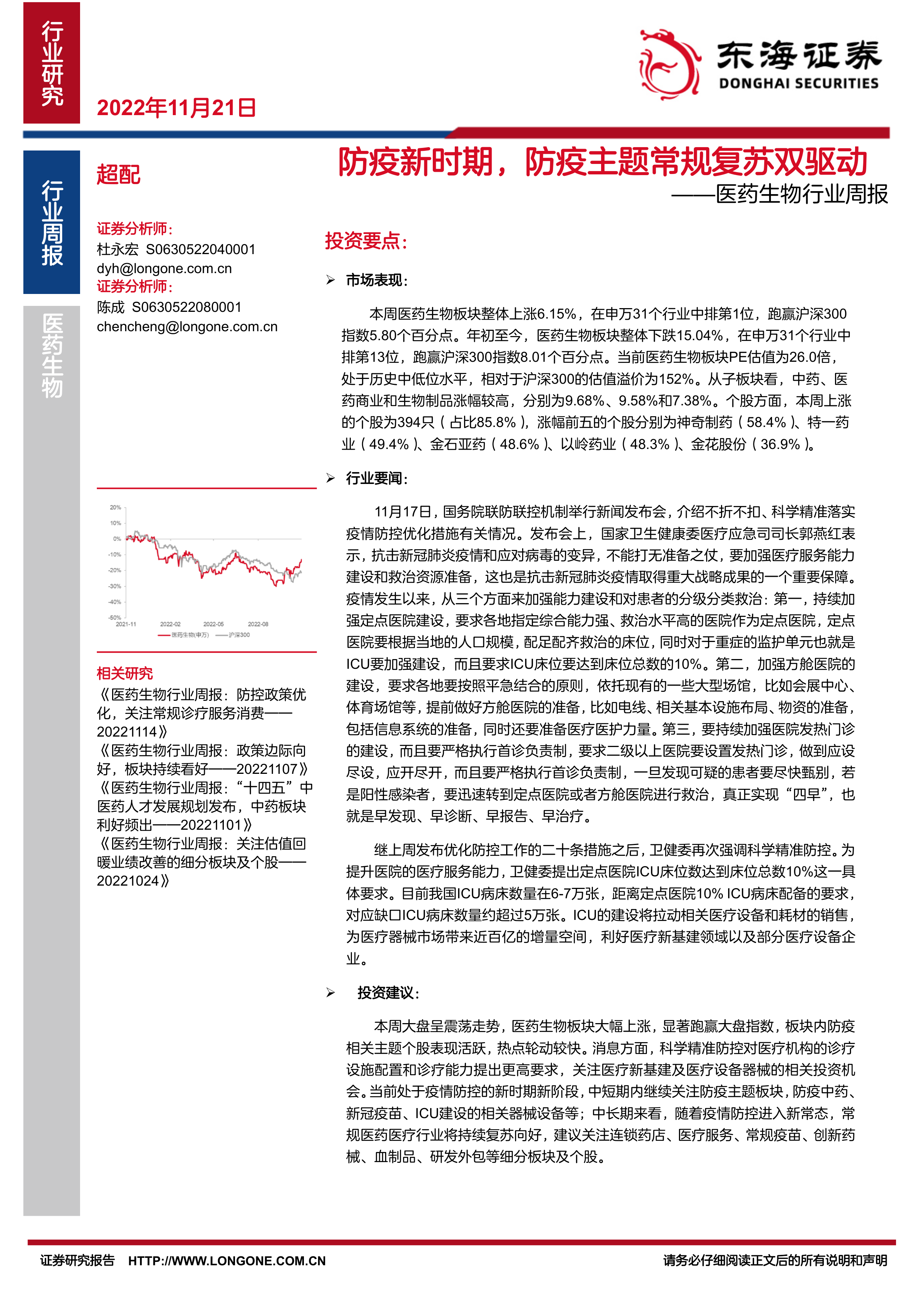 本报告核心观点指出,在2022年11月“防疫新时期”,医药生物行业呈现出“防疫主题常规复苏双驱动”的增长态势,并获得“超配”评级。市场表现强劲,板块整体上涨6.15%,领跑申万31个行业,且当前PE估值处于历史中低位,具备投资吸引力。