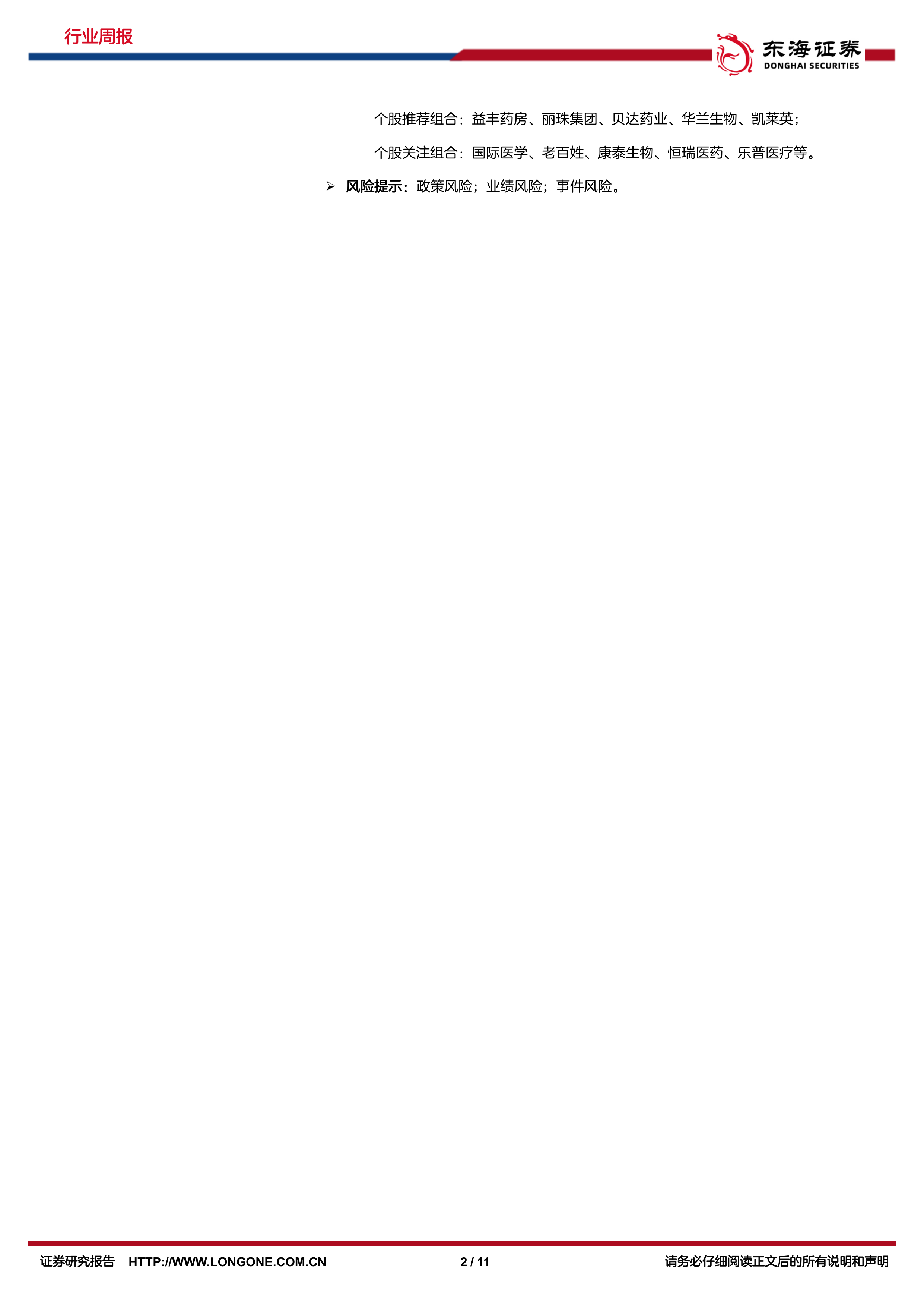 个股推荐组合:益丰药房、丽珠集团、贝达药业、华兰生物、凯莱英;