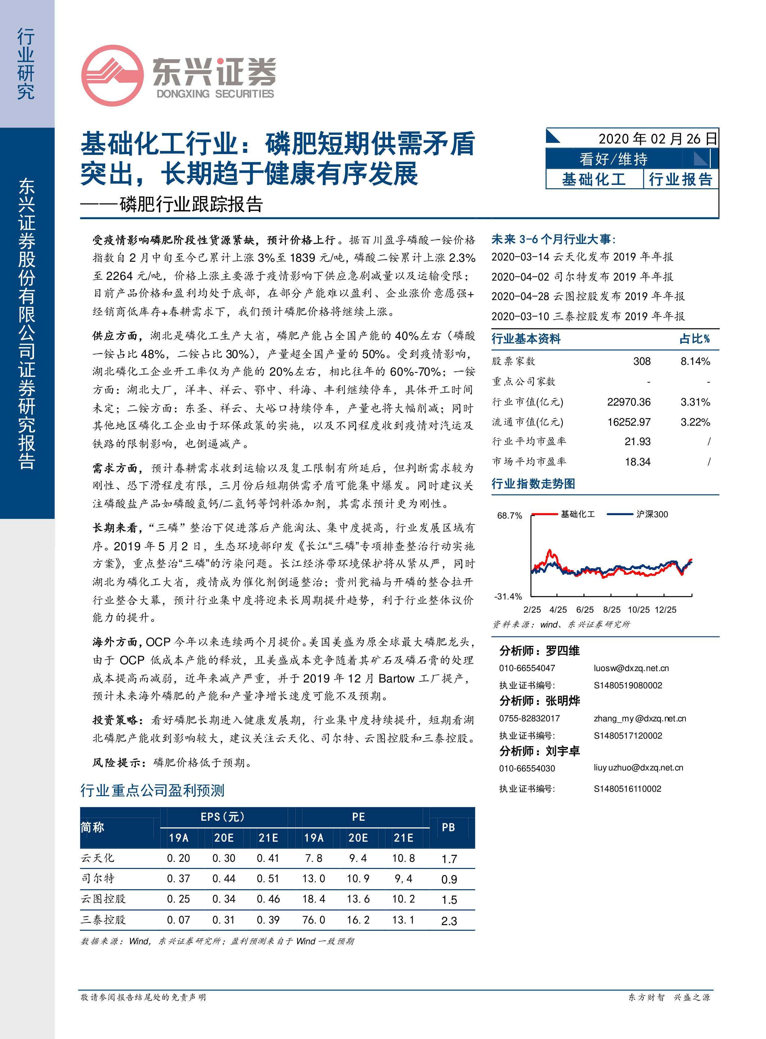 本报告分析了磷肥行业的短期供需矛盾和长期发展趋势。短期内,疫情导致湖北地区磷肥产能下降,运输受限,经销商库存低位,预计磷肥价格将上涨。长期来看,“三磷”整治和行业整合将提升行业集中度,海外产能增速可能放缓,磷肥行业有望进入健康发展期。建议关注云天化、司尔特、云图控股和三泰控股等相关上市公司。