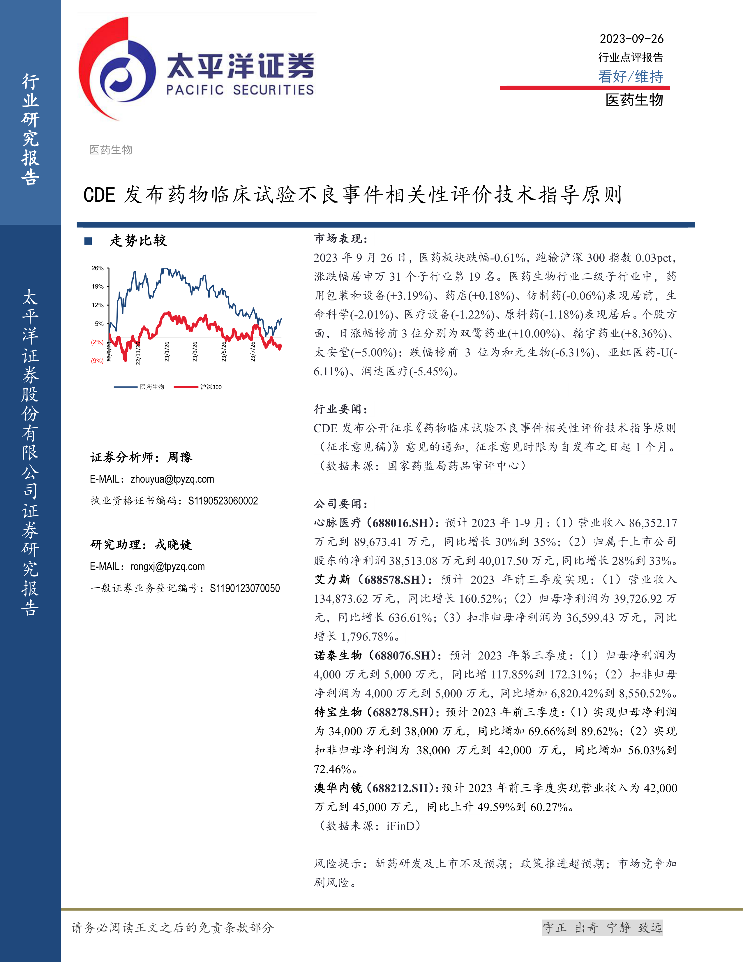 2023年9月26日,医药板块跌幅-0.61%,跑输沪深300指数0.03pct,涨跌幅居申万31个子行业第19名。医药生物行业二级子行业中,药用包装和设备(+3.19%)、药店(+0.18%)、仿制药(-0.06%)表现居前,生命科学(-2.01%)、医疗设备(-1.22%)、原料药(-1.18%)表现居后。个股方面,日涨幅榜前3位分别为双鹭药业(+10.00%)、翰宇药业(+8.36%)、太安堂(+5.00%);跌幅榜前3位为和元生物(-6.31%)、亚虹医药-U(-6.11%)、润达医疗(-5.45%)。