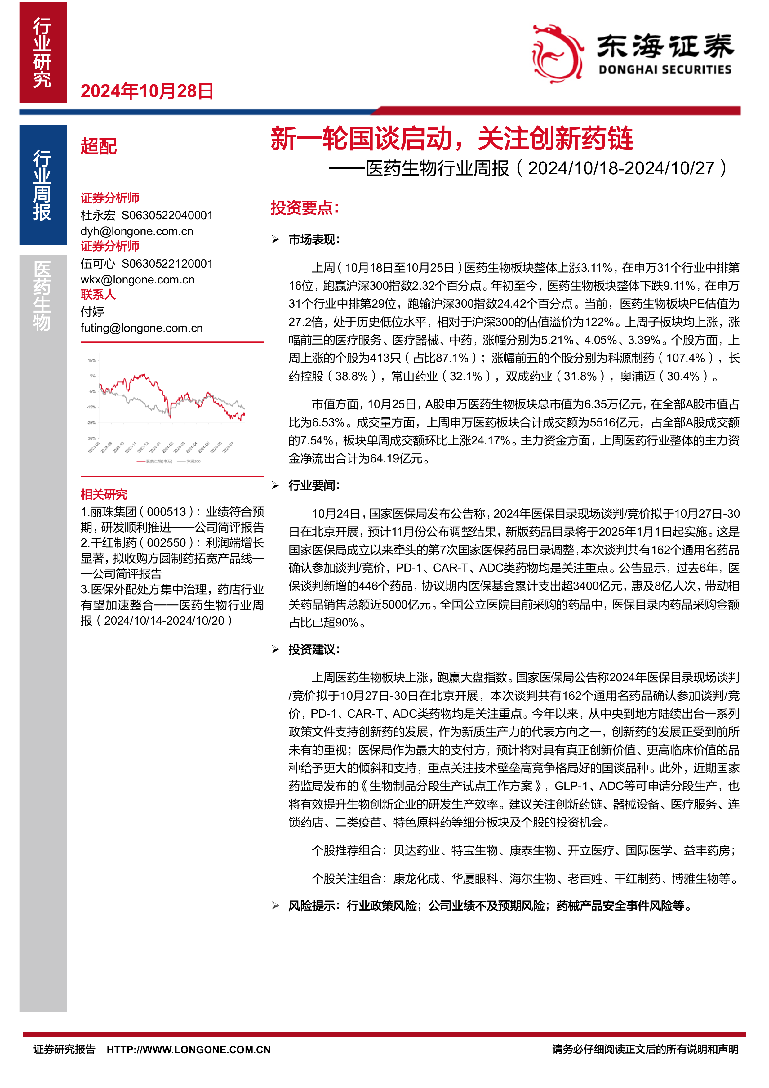 上周医药生物板块上涨,跑赢大盘指数。国家医保局公告称2024年医保目录现场谈判/竞价拟于10月27日-30日在北京开展,本次谈判共有162个通用名药品确认参加谈判/竞价,PD-1、CAR-T、ADC类药物均是关注重点。今年以来,从中央到地方陆续出台一系列政策文件支持创新药的发展,作为新质生产力的代表方向之一,创新药的发展正受到前所未有的重视;医保局作为最大的支付方,预计将对具有真正创新价值、更高临床价值的品种给予更大的倾斜和支持,重点关注技术壁垒高竞争格局好的国谈品种。此外,近期国家药监局发布的《生物制品分段生产试点工作方案》,GLP-1、ADC等可申请分段生产,也将有效提升生物创新企业的研发生产效率。建议关注创新药链、器械设备、医疗服务、连锁药店、二类疫苗、特色原料药等细分板块及个股的投资机会。