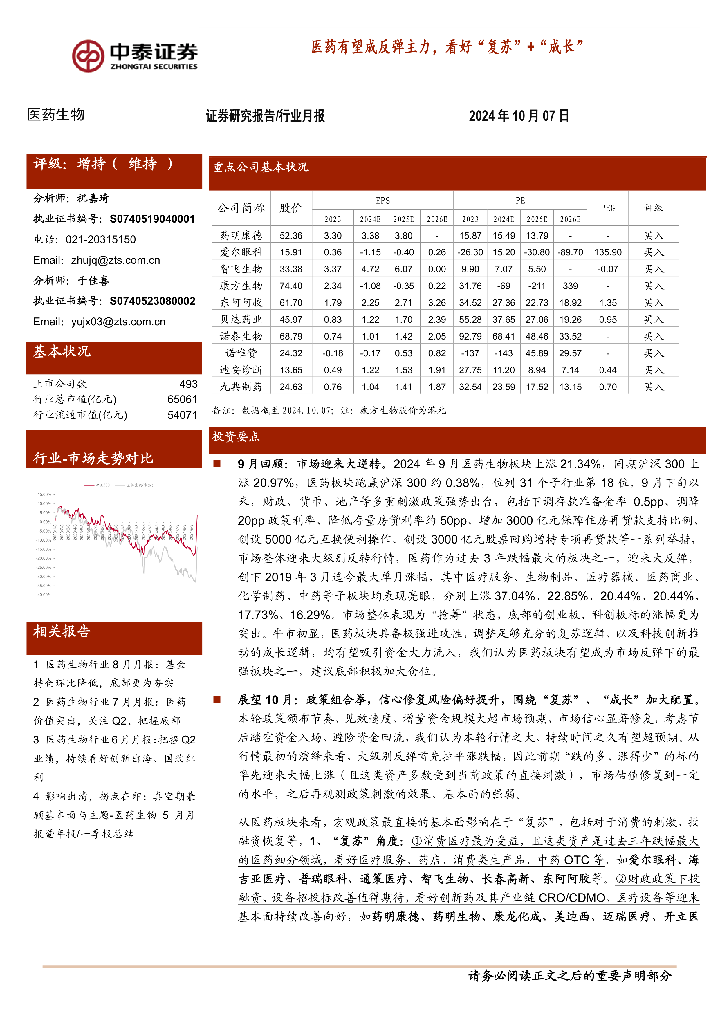 报告重点推荐了药明康德、爱尔眼科、智飞生物、康方生物、东阿阿胶、贝达药业、诺泰生物、诺唯赞、迪安诊断、九典制药等10家公司。中泰医药重点推荐组合9月平均涨幅为16.91%,跑输医药行业4.43%,其中康方生物(+39.71%)和贝达药业(+29.49%)表现亮眼。