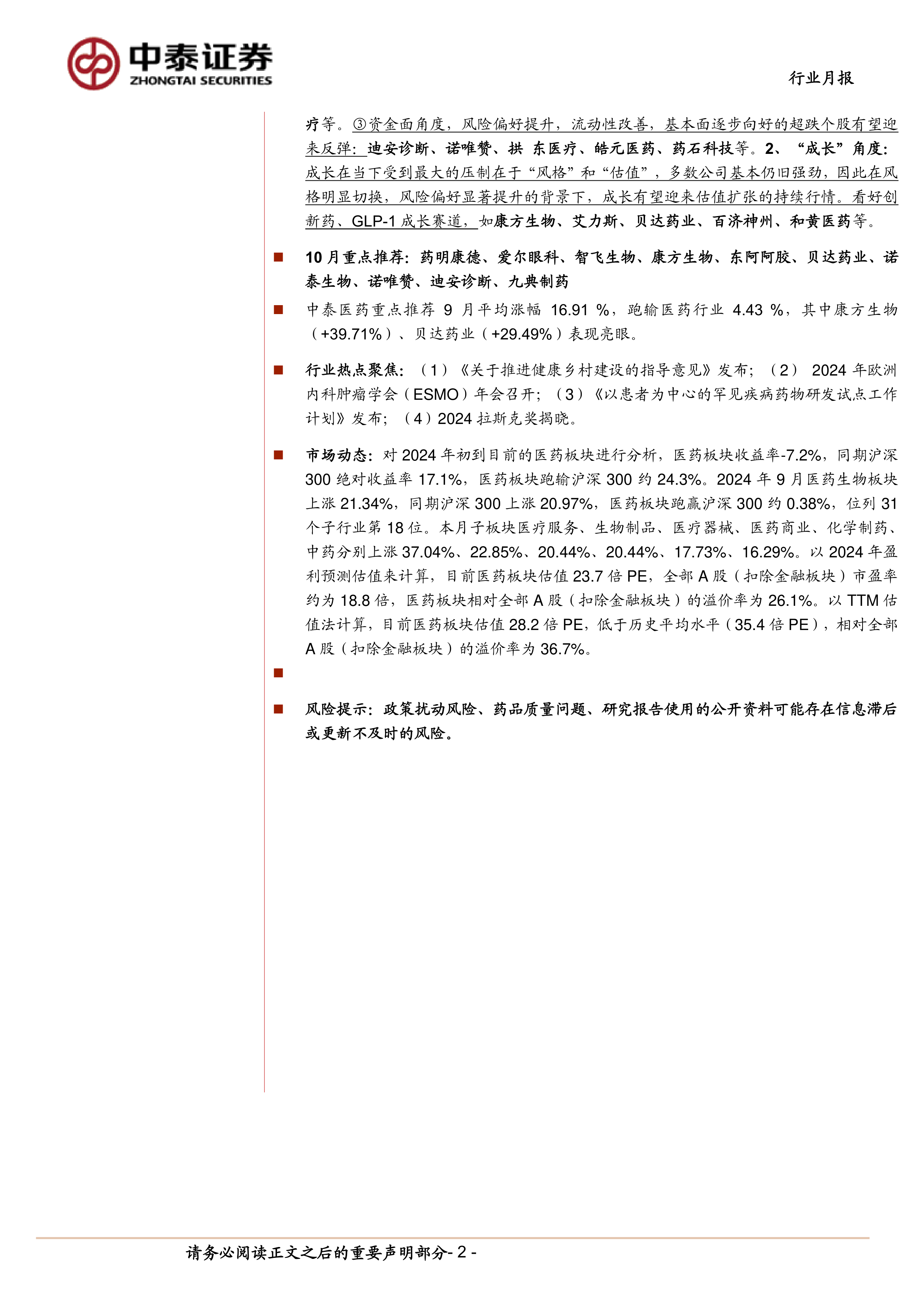 展望未来,报告建议投资者围绕“复苏”和“成长”两大核心主题进行配置。在“复苏”主题下,消费医疗、创新药产业链和医疗设备等领域将直接受益于宏观政策的刺激和投融资的改善。在“成长”主题下,创新药和GLP-1等高景气赛道在风险偏好提升的背景下有望实现估值扩张。同时,报告也聚焦了健康乡村建设、ESMO年会、罕见病药物研发试点和拉斯克奖等行业热点,揭示了政策导向和科技创新对行业发展的深远影响。尽管市场前景乐观,报告也提醒投资者关注政策扰动、药品质量和信息滞后等潜在风险。