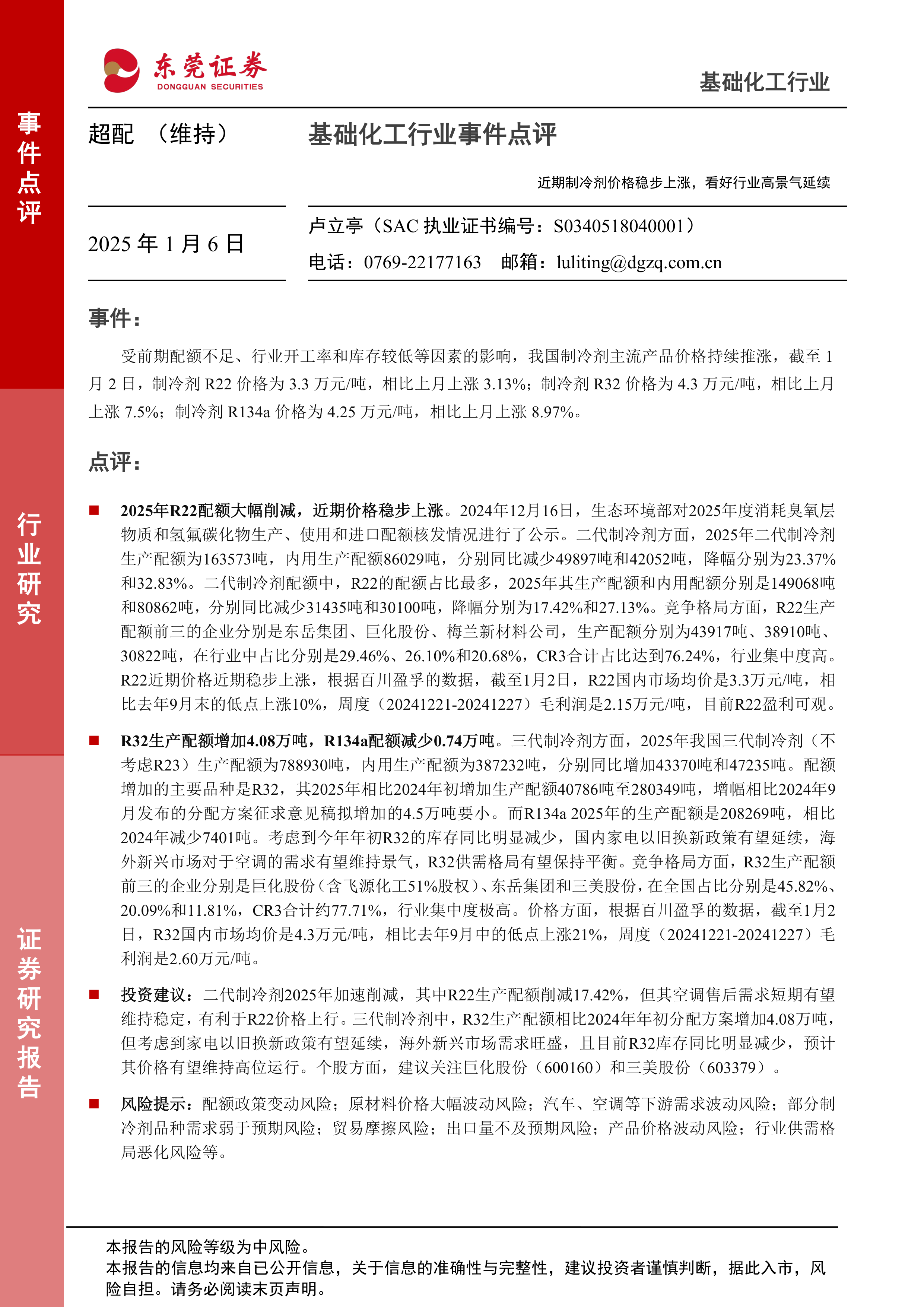 本报告分析了近期制冷剂价格上涨的事件,指出受配额削减、行业低开工率和低库存等因素影响,R22、R32、R134a价格均呈现上涨趋势。报告重点分析了R22和R32的配额情况、行业竞争格局和盈利能力,并建议关注巨化股份和三美股份。同时,报告也提示了配额政策变动、原材料价格波动、下游需求波动等风险。总体而言,本报告认为制冷剂行业景气度有望延续,建议投资者关注相关投资机会。