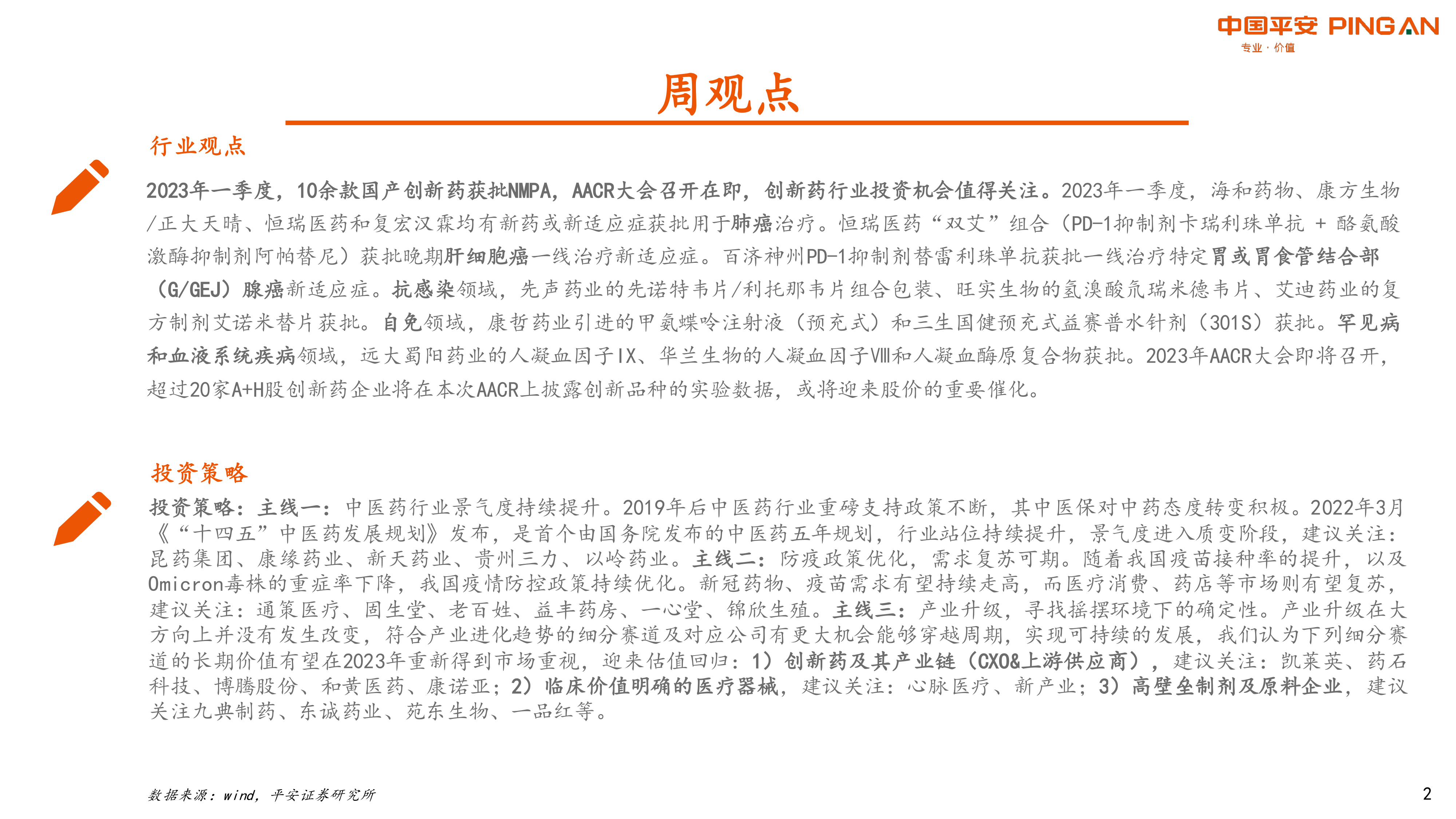 报告提出三大投资主线:一是中医药行业景气度提升;二是防疫政策优化带来的需求复苏;三是产业升级背景下,寻找具有确定性的细分赛道,如创新药产业链、临床价值明确的医疗器械以及高壁垒制剂及原料企业。