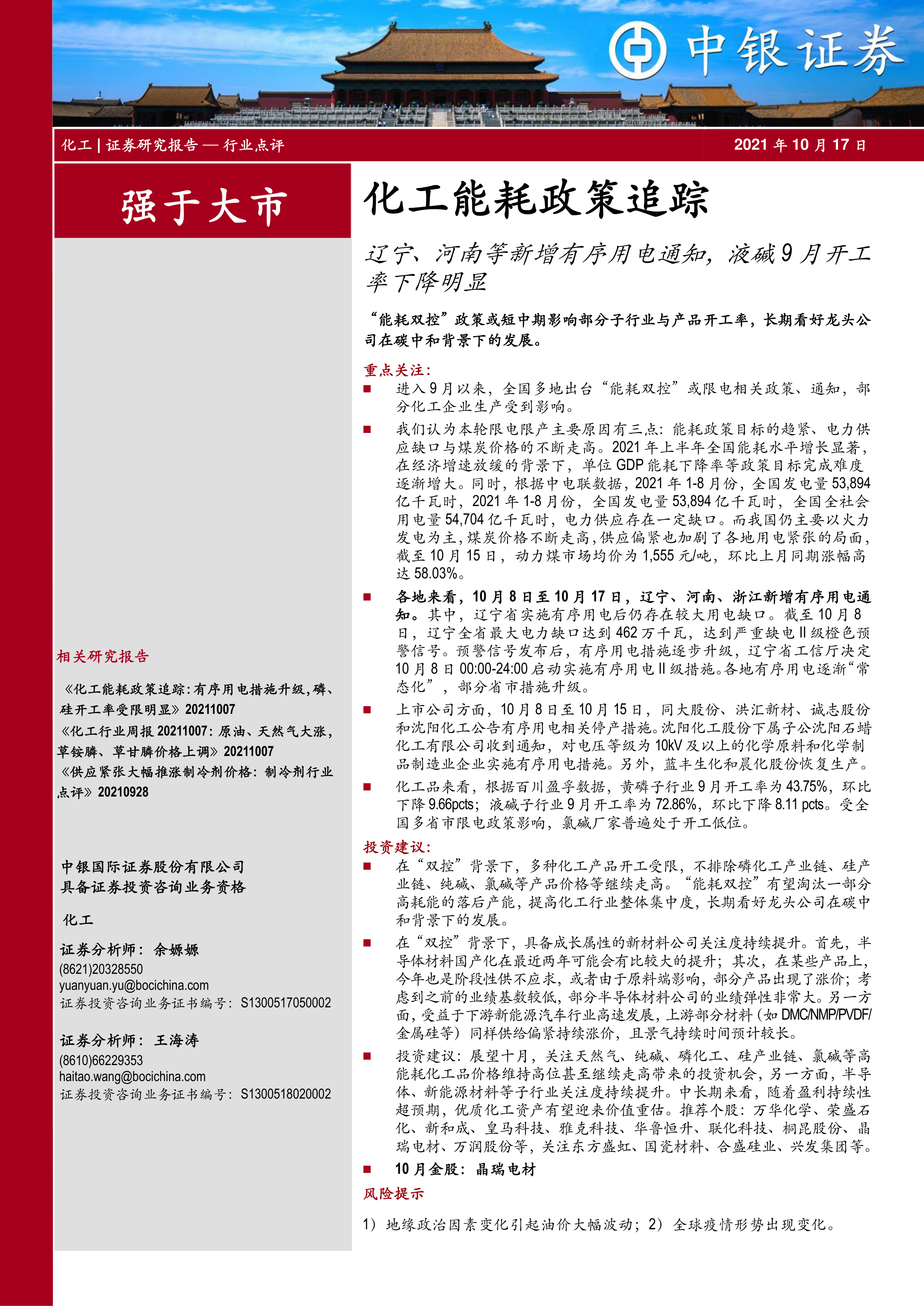 本报告深入分析了2021年10月中国化工行业面临的“能耗双控”政策及限电限产影响。报告指出,政策目标趋紧、电力供应缺口和动力煤价格上涨是导致限电限产的主要原因,已导致黄磷、液碱等重点化工产品开工率显著下降,并促使多家上市公司公告停产。展望未来,该政策短期内可能推高高耗能化工品价格,长期则有利于行业集中度提升和龙头企业在碳中和背景下的发展。投资建议聚焦于高能耗化工品价格上涨带来的机会,以及半导体材料和新能源材料等成长性新材料领域,并推荐了包括万华化学、晶瑞电材在内的多只优质个股。同时,报告提示了地缘政治和疫情变化可能带来的风险。