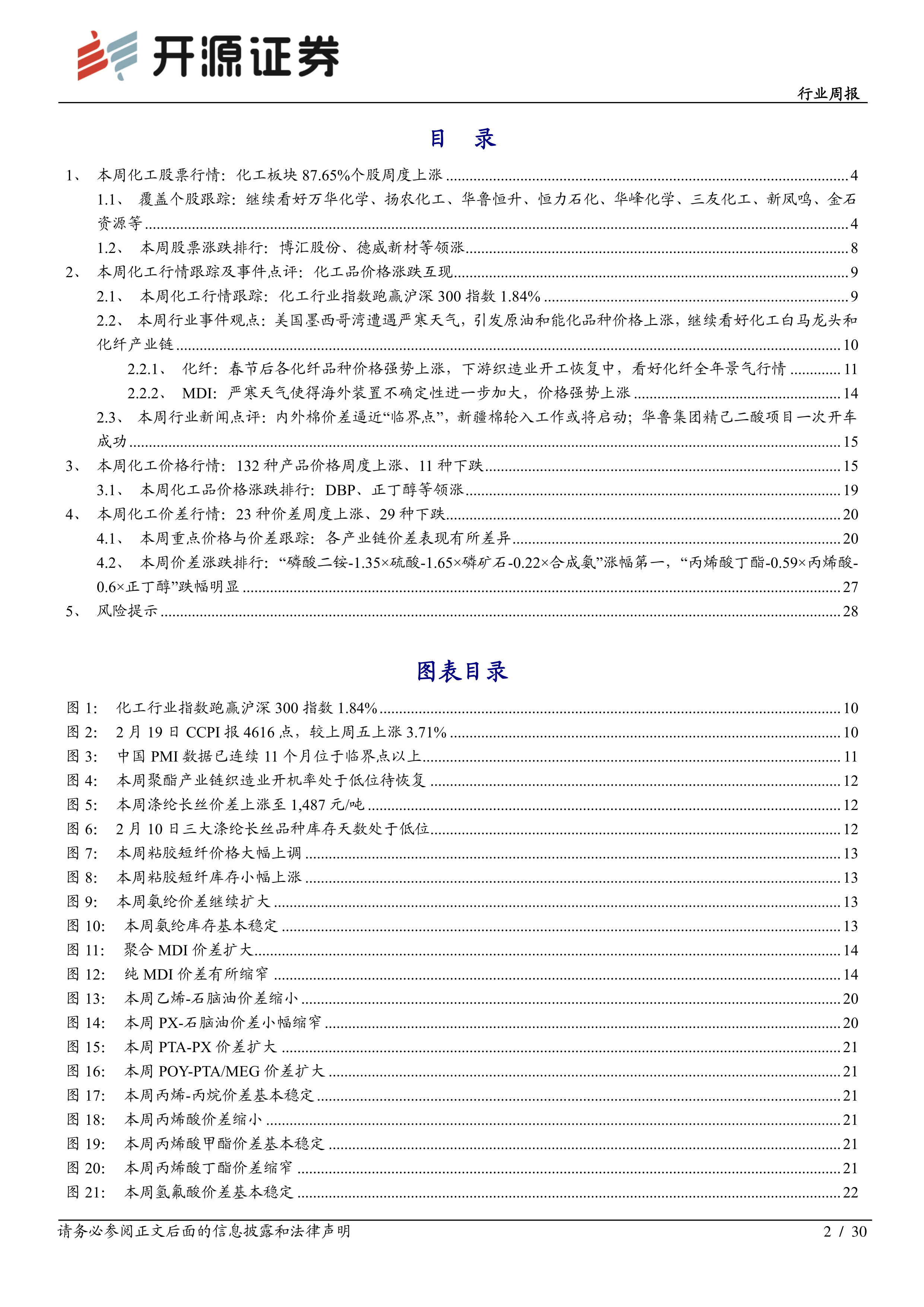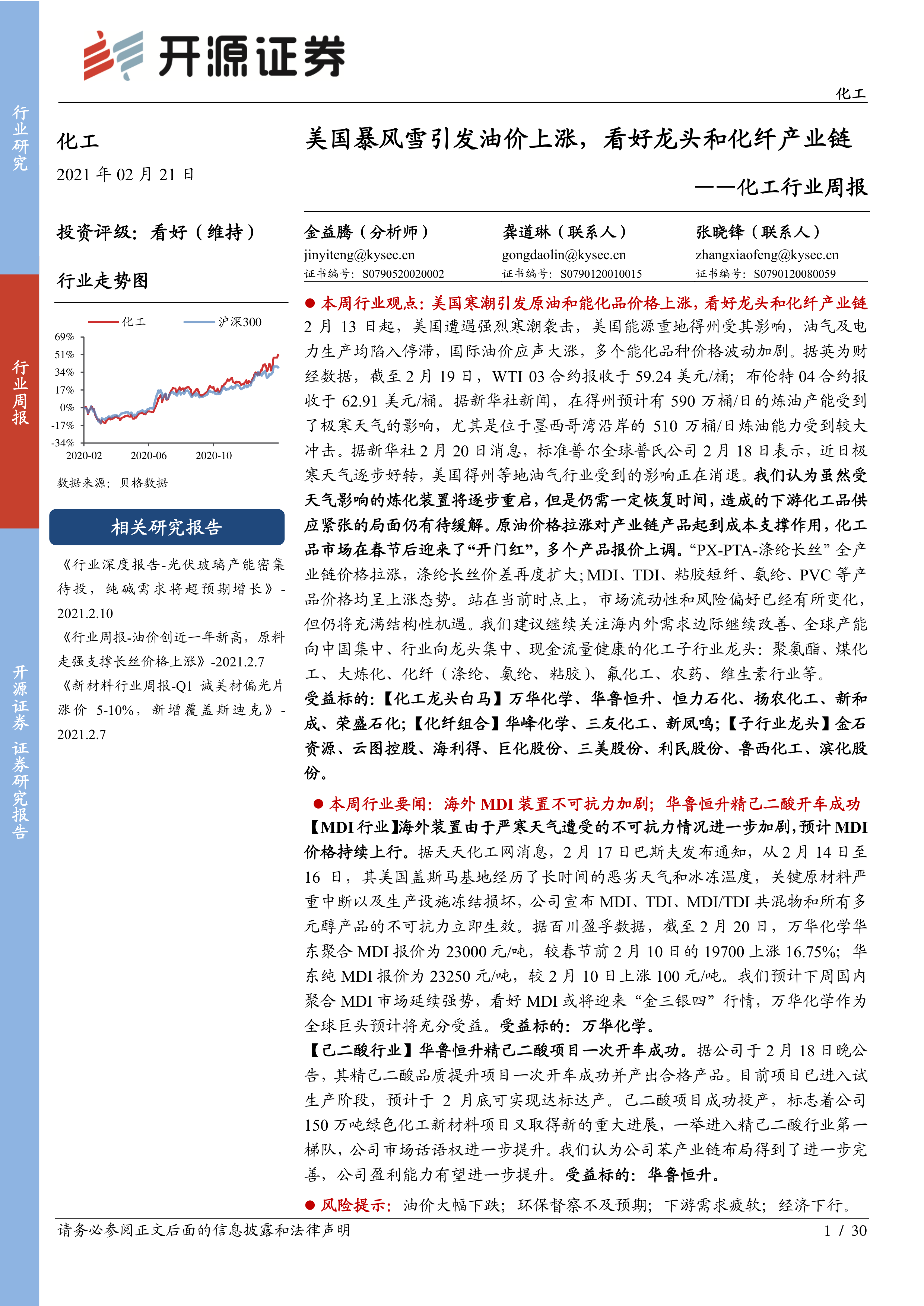 2 月 13 日起,美国遭遇强烈寒潮袭击, 美国能源重地得州受其影响,油气及电力生产均陷入停滞, 国际油价应声大涨, 多个能化品种价格波动加剧。 据英为财经数据,截至 2 月 19 日, WTI 03 合约报收于 59.24 美元/桶;布伦特 04 合约报收于 62.91 美元/桶。 据新华社新闻,在得州预计有 590 万桶/日的炼油产能受到了极寒天气的影响,尤其是位于墨西哥湾沿岸的 510 万桶/日炼油能力受到较大冲击。 据新华社 2 月 20 日消息, 标准普尔全球普氏公司 2 月 18 日表示,近日极寒天气逐步好转, 美国得州等地油气行业受到的影响正在消退。 我们认为虽然受天气影响的炼化装置将逐步重启,但是仍需一定恢复时间,造成的下游化工品供应紧张的局面仍有待缓解。 原油价格拉涨对产业链产品起到成本支撑作用, 化工品市场在春节后迎来了“开门红”, 多个产品报价上调。“ PX-PTA-涤纶长丝”全产业链价格拉涨,涤纶长丝价差再度扩大; MDI、 TDI、粘胶短纤、氨纶、 PVC 等产品价格均呈上涨态势。站在当前时点上,市场流动性和风险偏好已经有所变化,但仍将充满结构性机遇。我们建议继续关注海内外需求边际继续改善、全球产能向中国集中、行业向龙头集中、现金流量健康的化工子行业龙头:聚氨酯、煤化工、大炼化、化纤(涤纶、氨纶、粘胶)、氟化工、农药、维生素行业等。