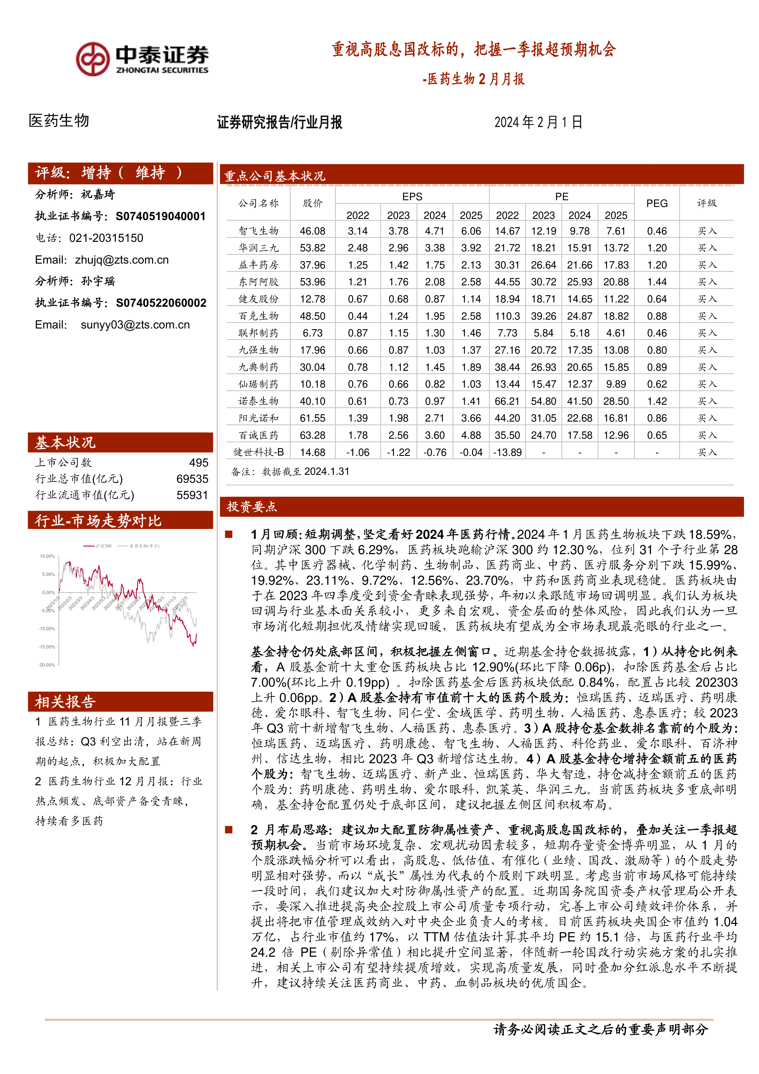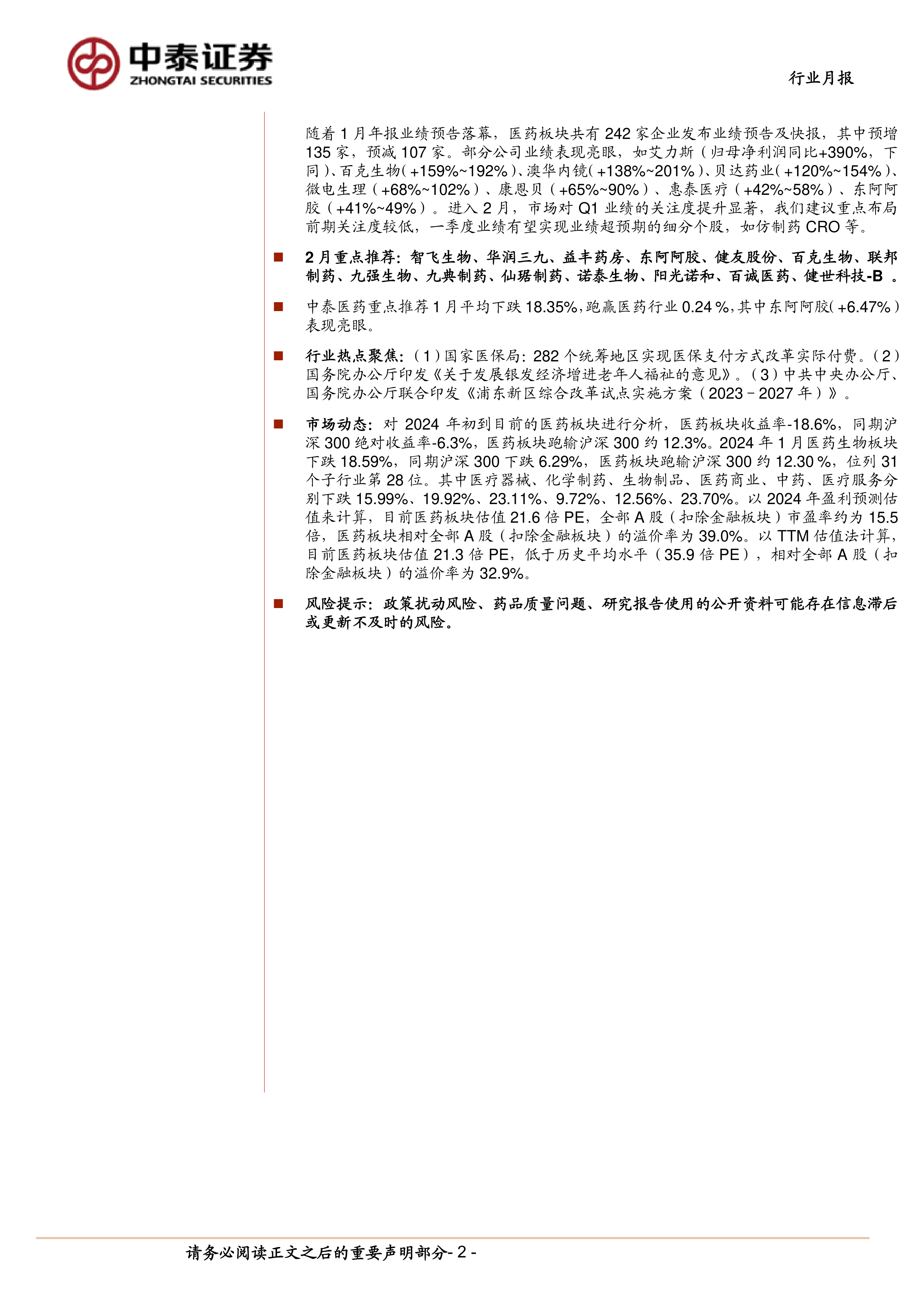 报告2月重点推荐了14家公司,包括智飞生物、华润三九、益丰药房、东阿阿胶、健友股份、百克生物、联邦制药、九强生物、九典制药、仙琚制药、诺泰生物、阳光诺和、百诚医药、健世科技-B。这些推荐主要基于其核心产品放量、业绩稳健增长、国改催化、创新管线进展以及市场独占优势等因素。例如,智飞生物受益于HPV疫苗和带状疱疹疫苗放量,以及自研管线逐步收获;华润三九和东阿阿胶则因业绩稳健增长和国改赋能受到关注;健友股份因重磅产品LuX-Valve有望成为国内首发三尖瓣置换产品而备受期待。1月中泰医药重点推荐组合平均下跌18.35%,跑赢医药行业0.24%,其中东阿阿胶表现亮眼,上涨6.47%。