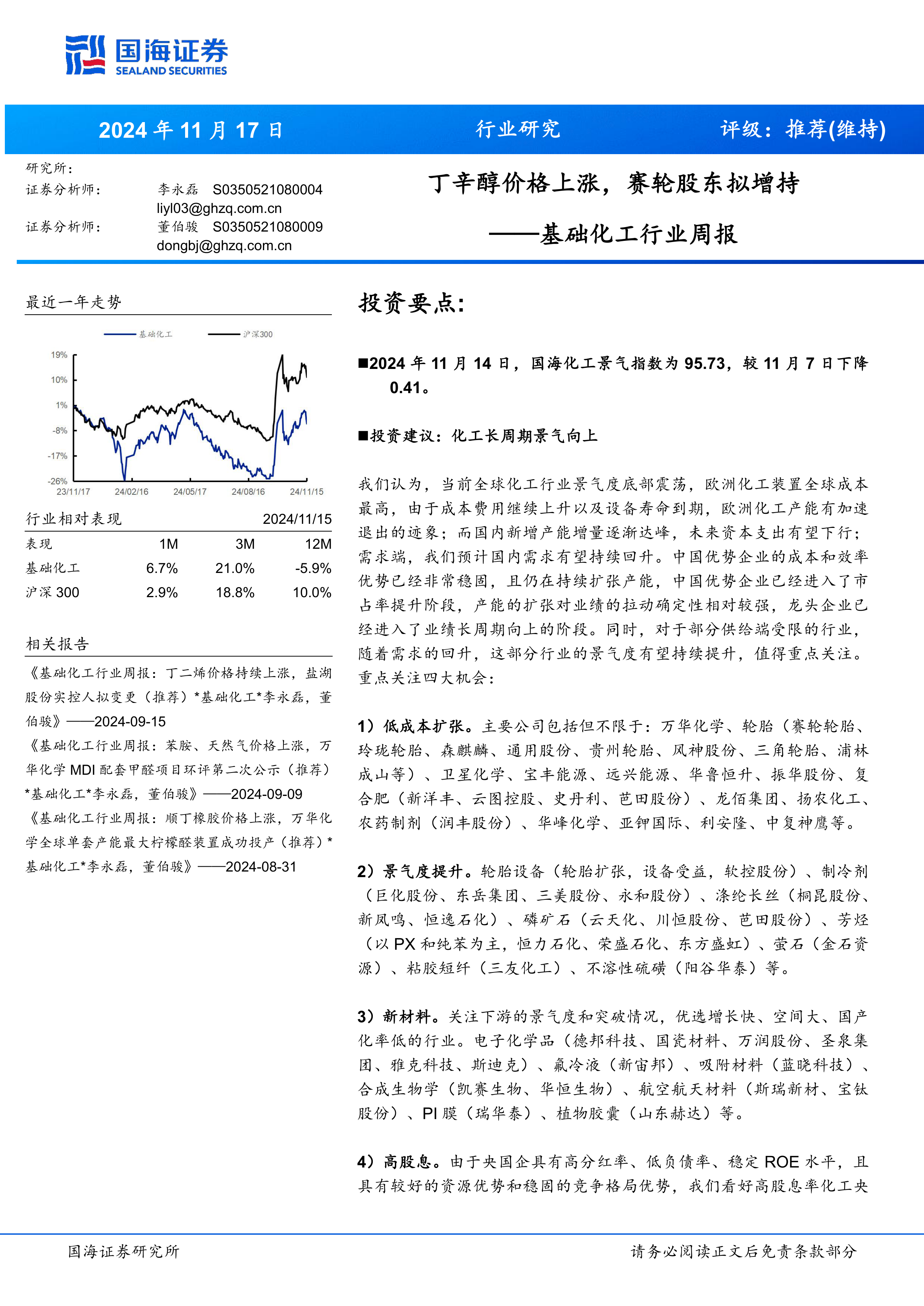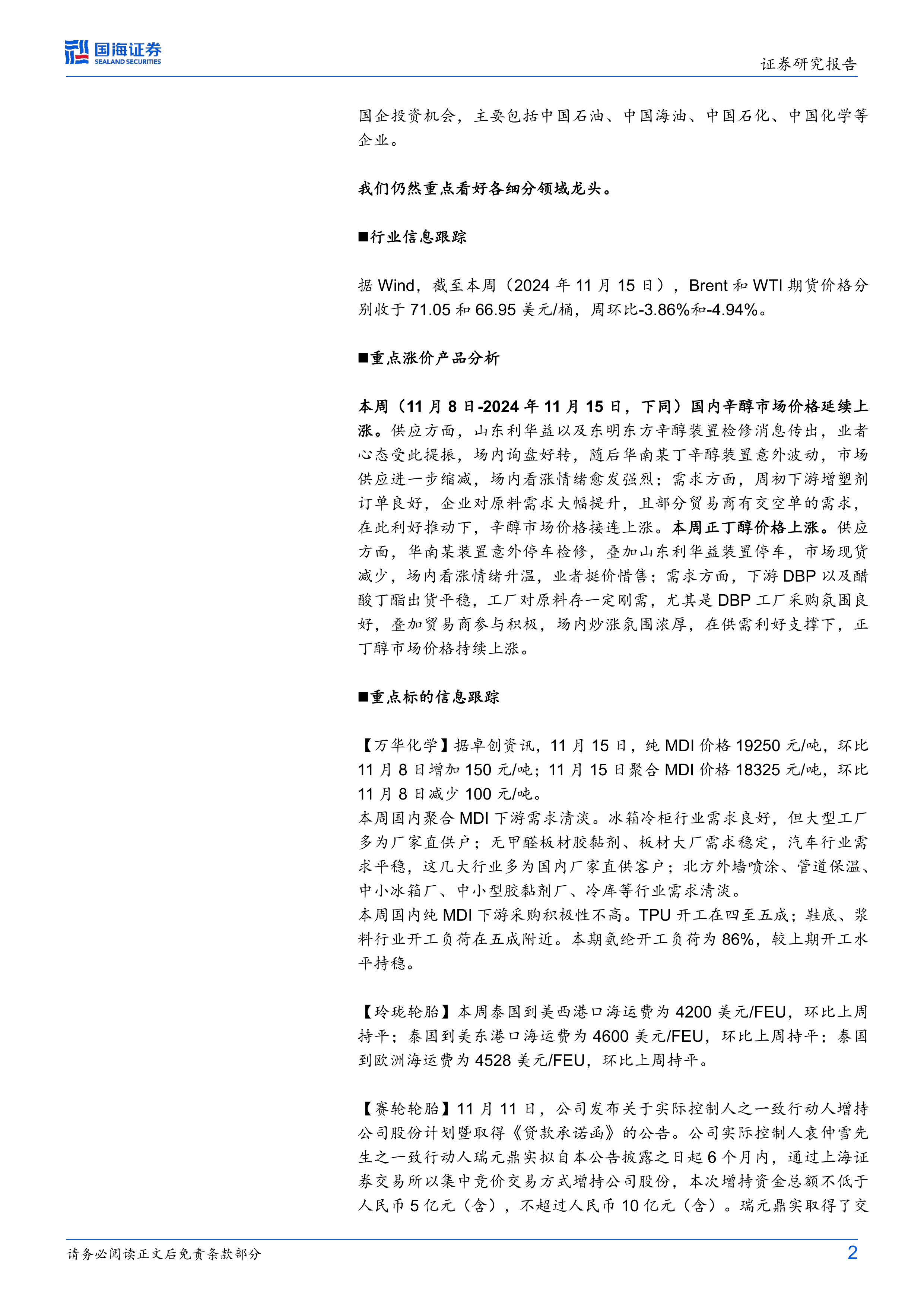 基础化工行业周报:丁辛醇价格上涨,赛轮股东拟增持