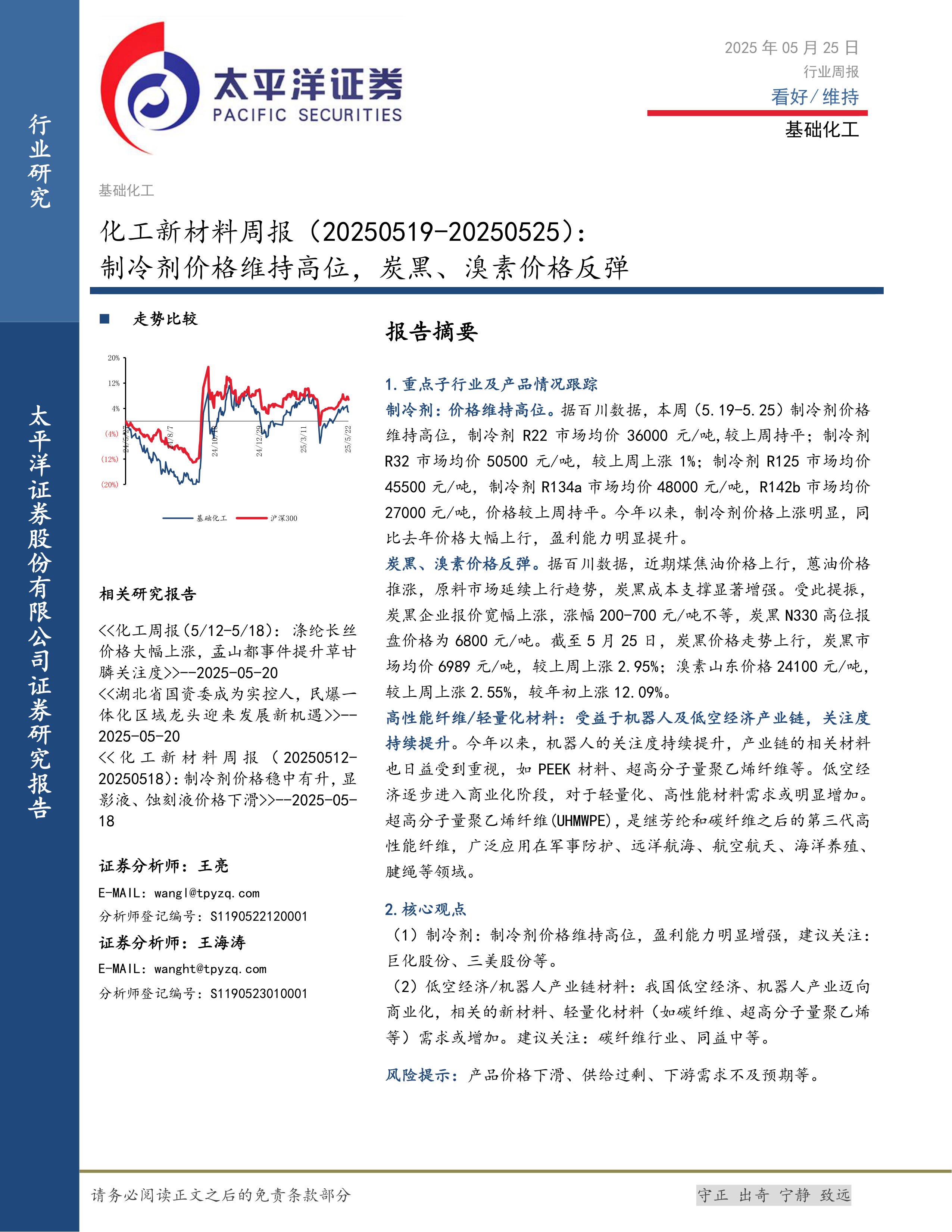 本报告分析了近期基础化工行业的市场动态,重点关注了制冷剂、新材料、电子化学品、锂电/储能材料、光伏/风电材料、生物基材料、可再生塑料以及涂料油墨颜料等细分领域的价格走势和市场表现。报告还跟踪了重点公司的公告和行业重要新闻,并列出了重点推荐的投资标的。总体来看,制冷剂价格维持高位,新材料领域受益于新兴产业的发展,部分化工产品价格出现波动,投资者应关注市场变化,谨慎决策。