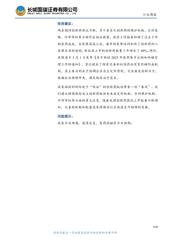 本报告分析了两会期间关于创新药的热议和相关政策提案,指出政府对创新药的保护机制、定价策略和评审审批等方面都将有所改进,为创新药板块带来利好。