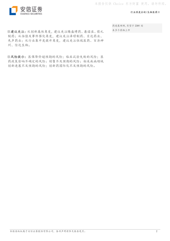 风险提示:医保降价超预期的风险;临床试验失败的风险;医药政策影响不确定的风险;销售不及预期的风险;相关疾病领域创新进展不及预期的风险;创新药国际化不及预期的风险。