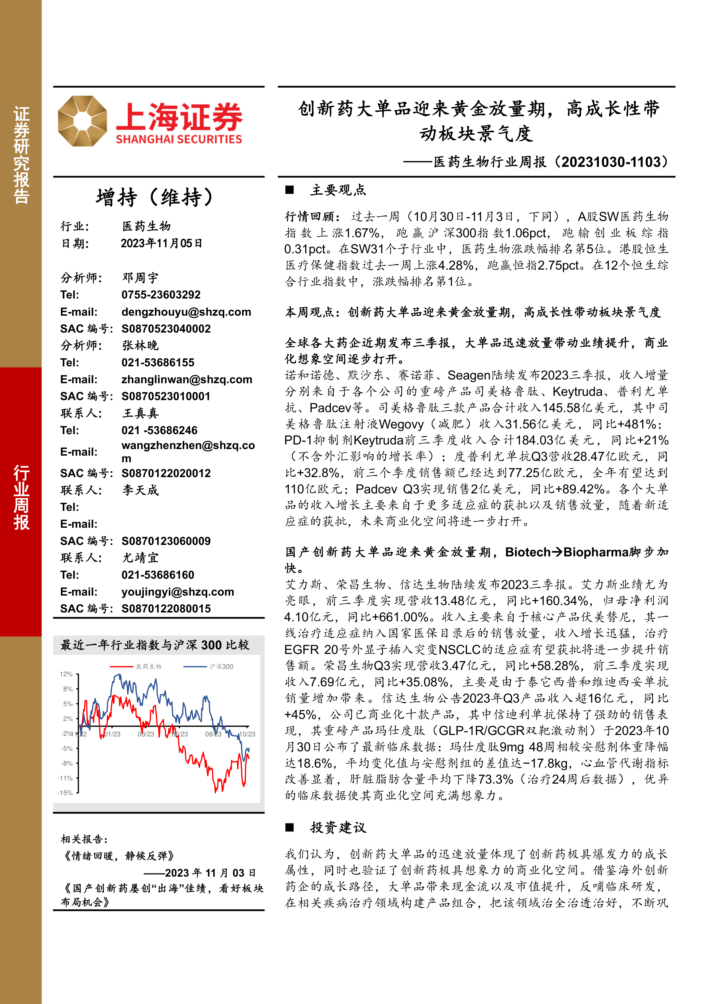 本周观点: 创新药大单品迎来黄金放量期,高成长性带动板块景气度全球各大药企近期发布三季报,大单品迅速放量带动业绩提升,商业化想象空间逐步打开。
